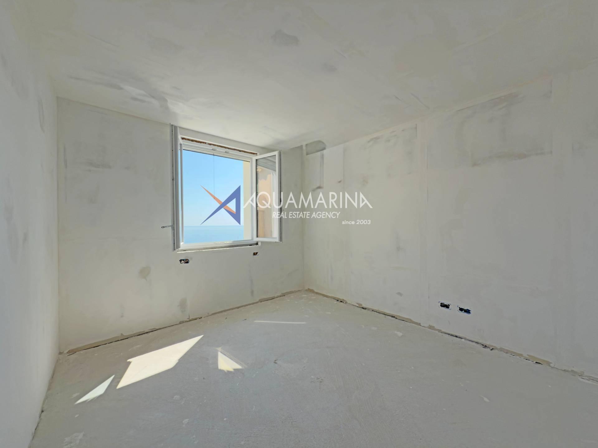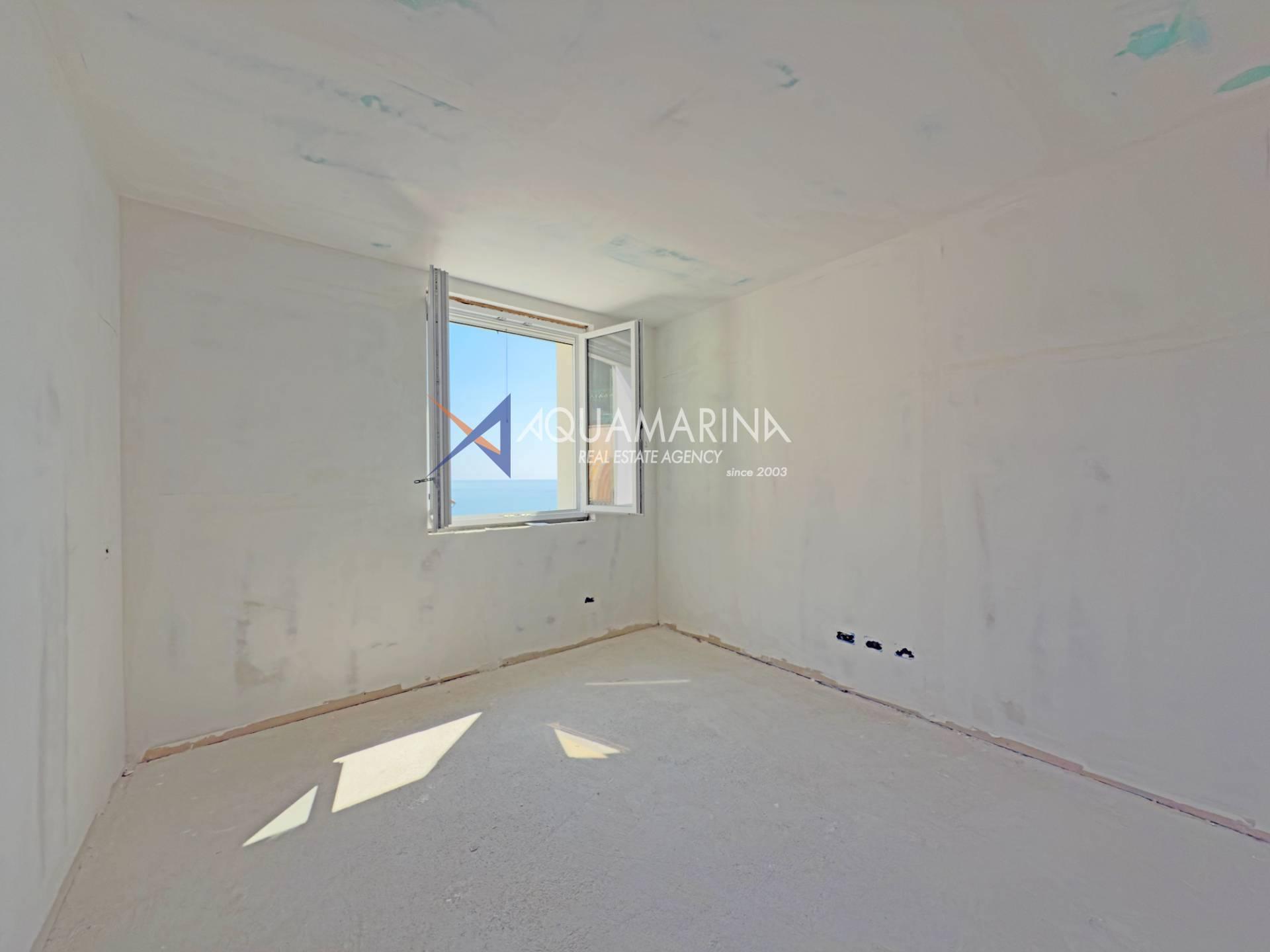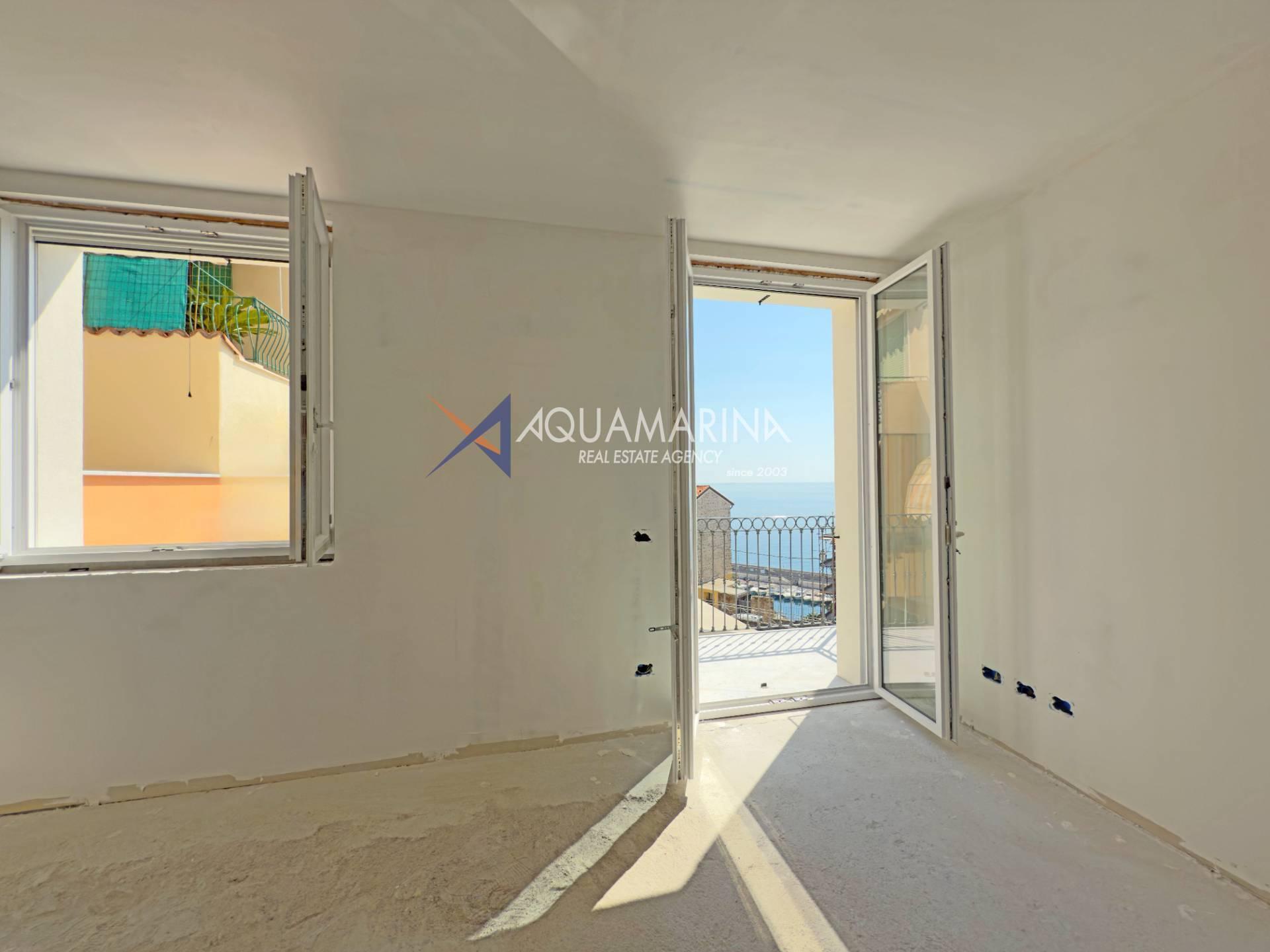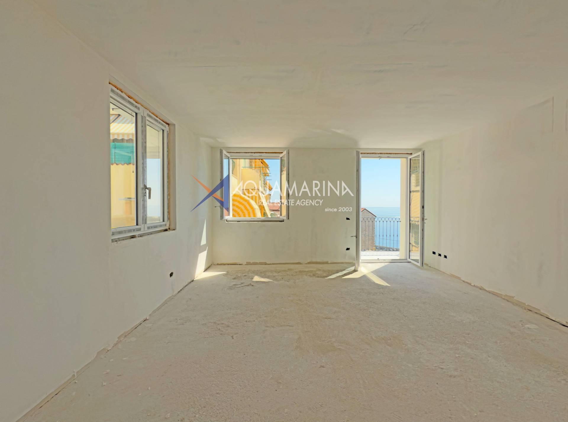 L'appartement comprend une entrée, un séjour avec cuisine ouverte, deux chambres et deux salles de bains. Il dispose également d'un bel espace extérieur offrant une vue panoramique sur Bordighera Alta.
