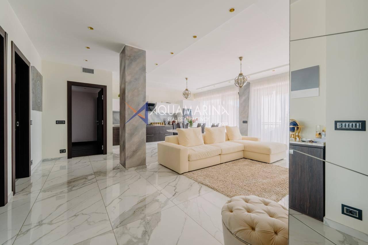 Spacieux appartement de trois pièces de 113 m² avec deux salles de bains, débarras, terrasse et balcon dans une résidence privée et isolée, à quelques minutes de la plage.