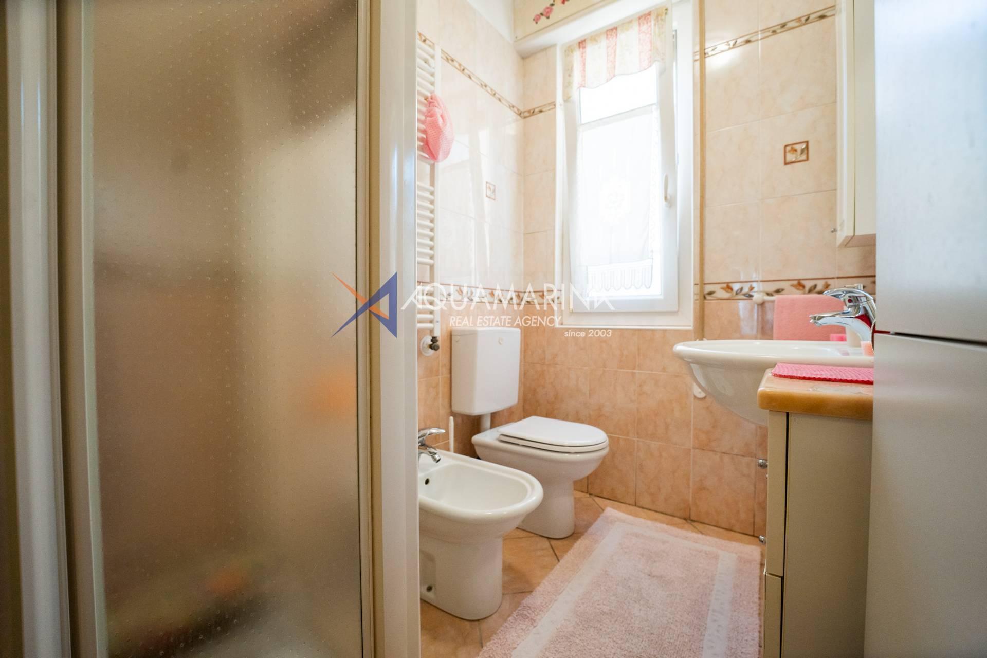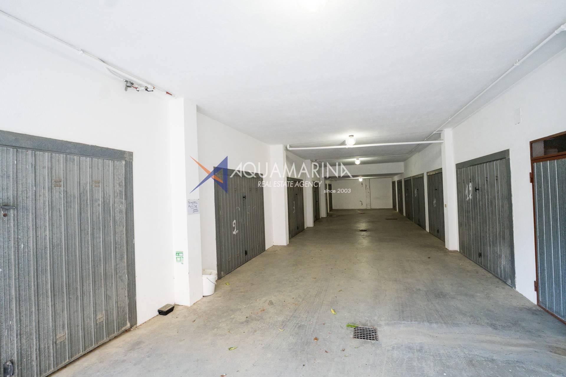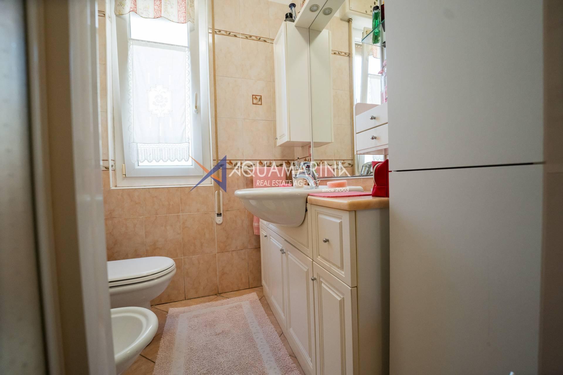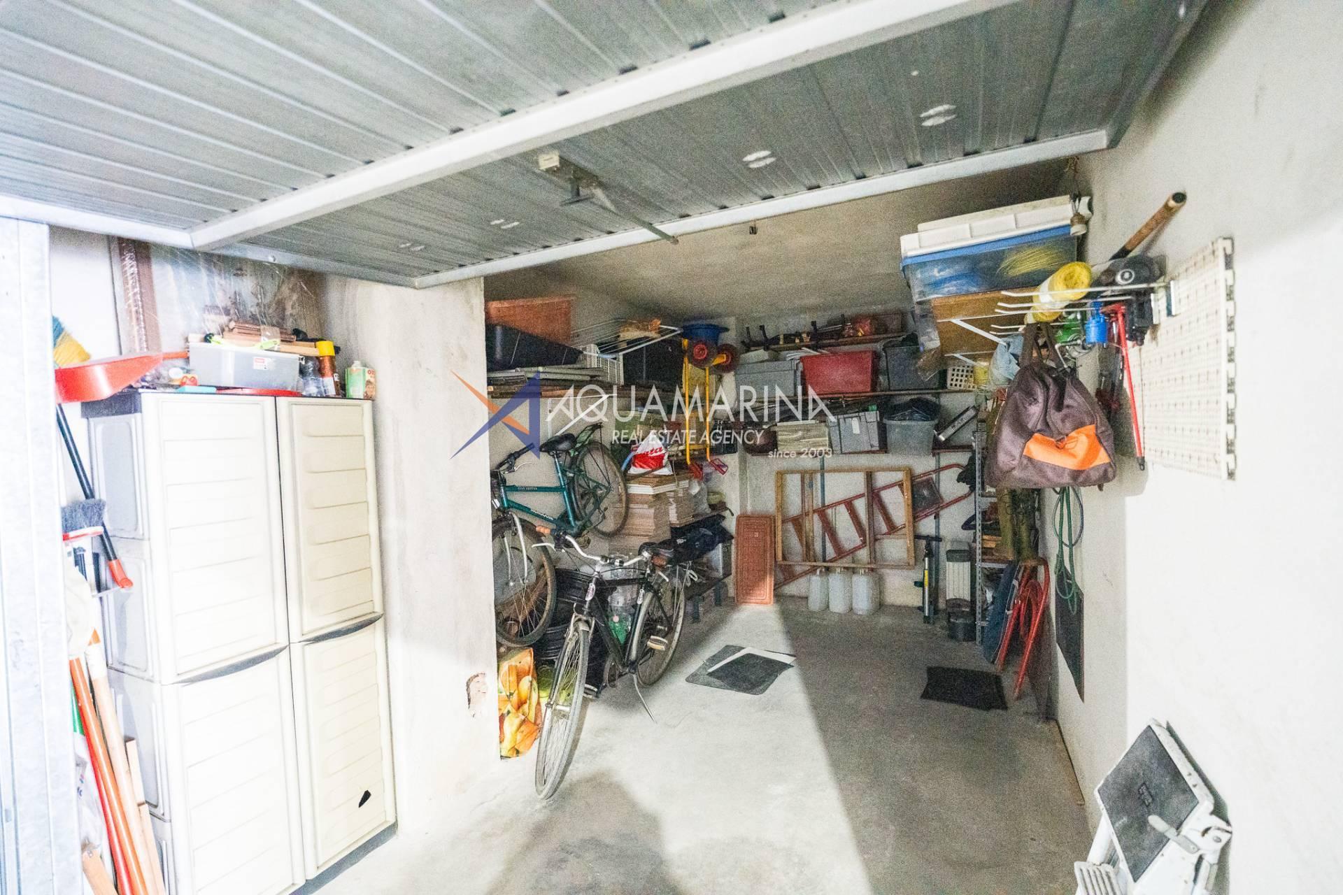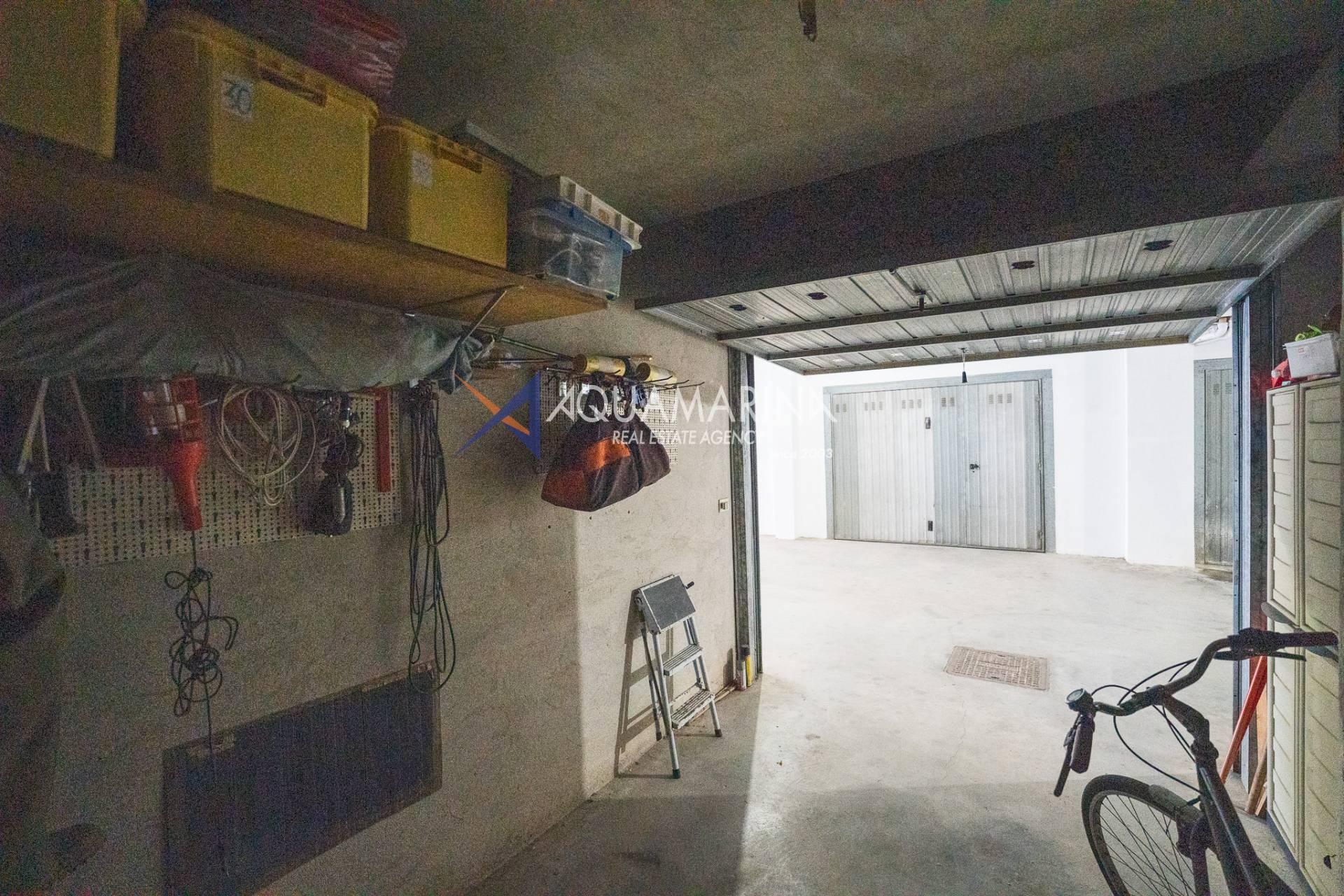 L'appartement comprend un hall d'entrée spacieux, une salle de bains, trois chambres, un séjour lumineux et aéré avec cuisine ouverte, un balcon latéral et une grande terrasse aménagée avec vue sur la mer. Un garage est inclus dans le prix. Le chauffage est individuel grâce à une chaudière au gaz naturel ; l'appartement a été entièrement rénové. Les fenêtres sont en aluminium blanc à double vitrage.