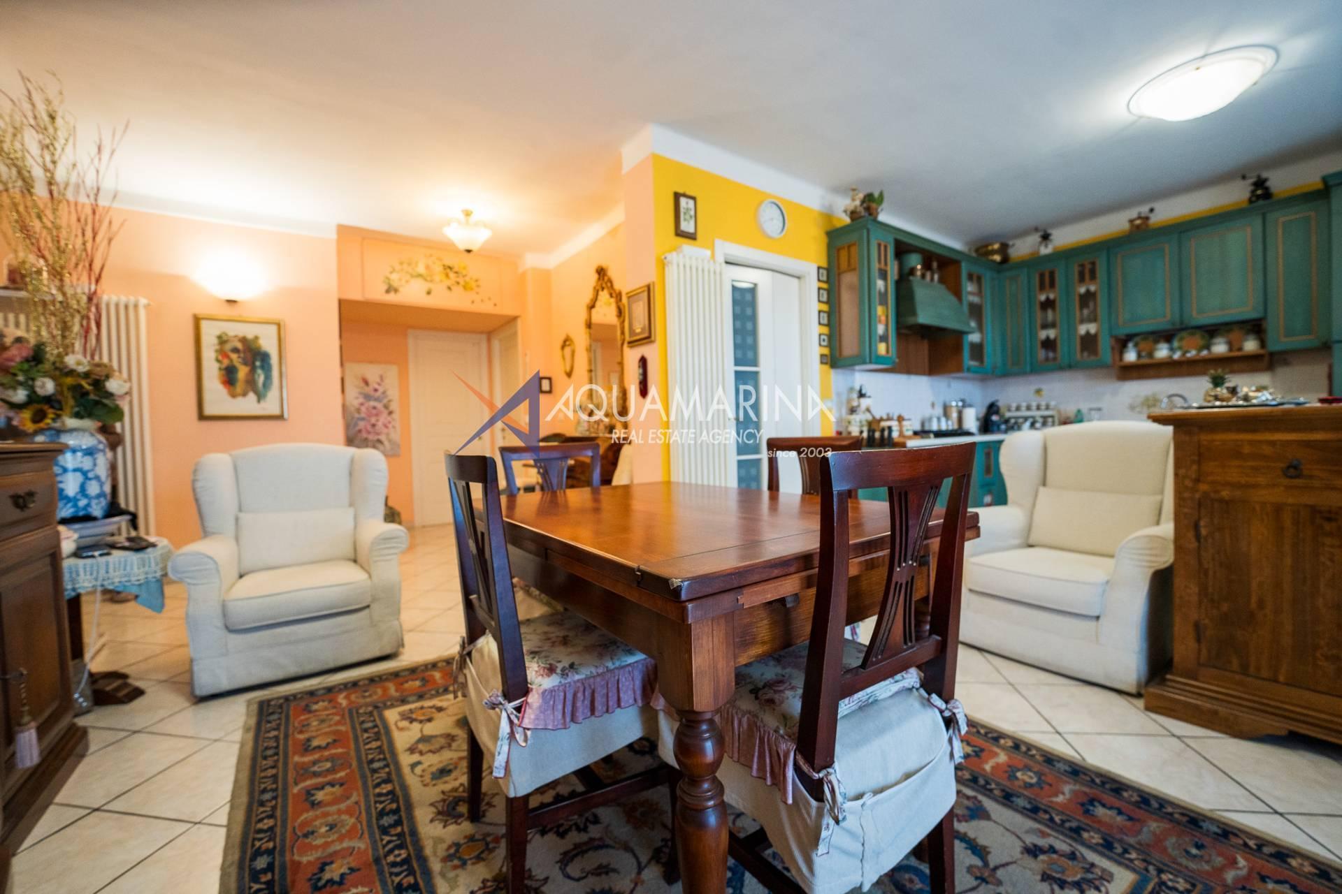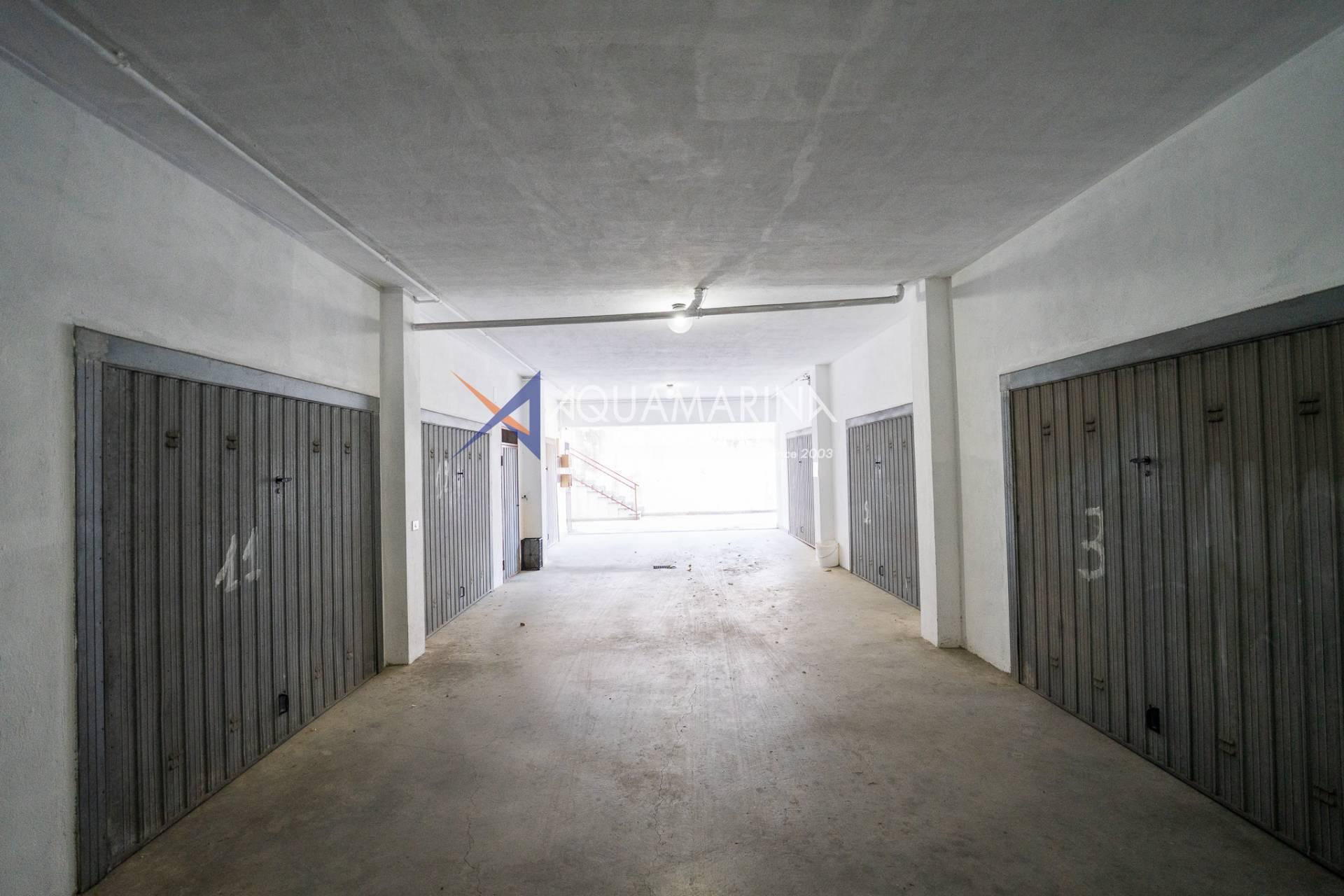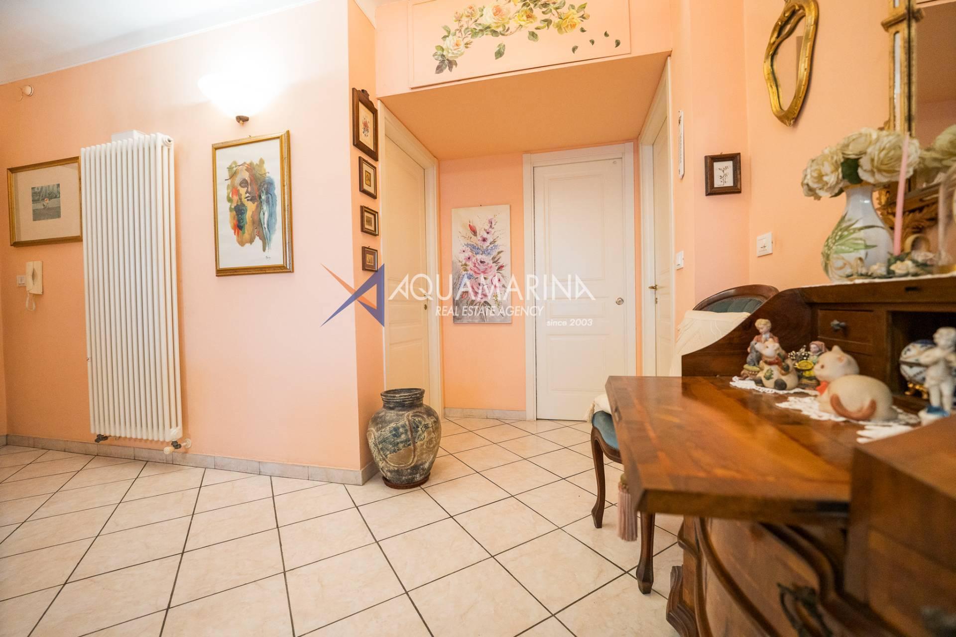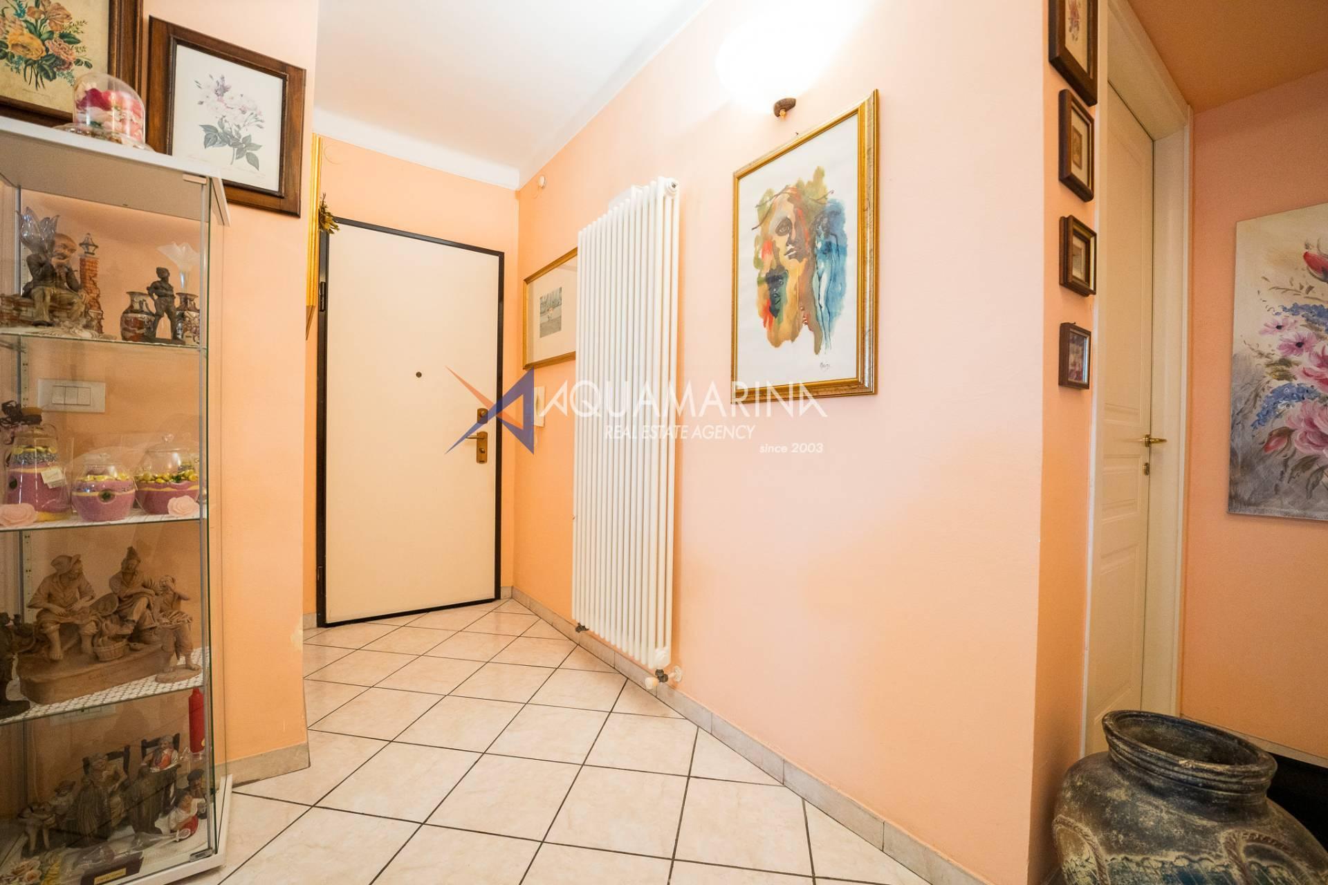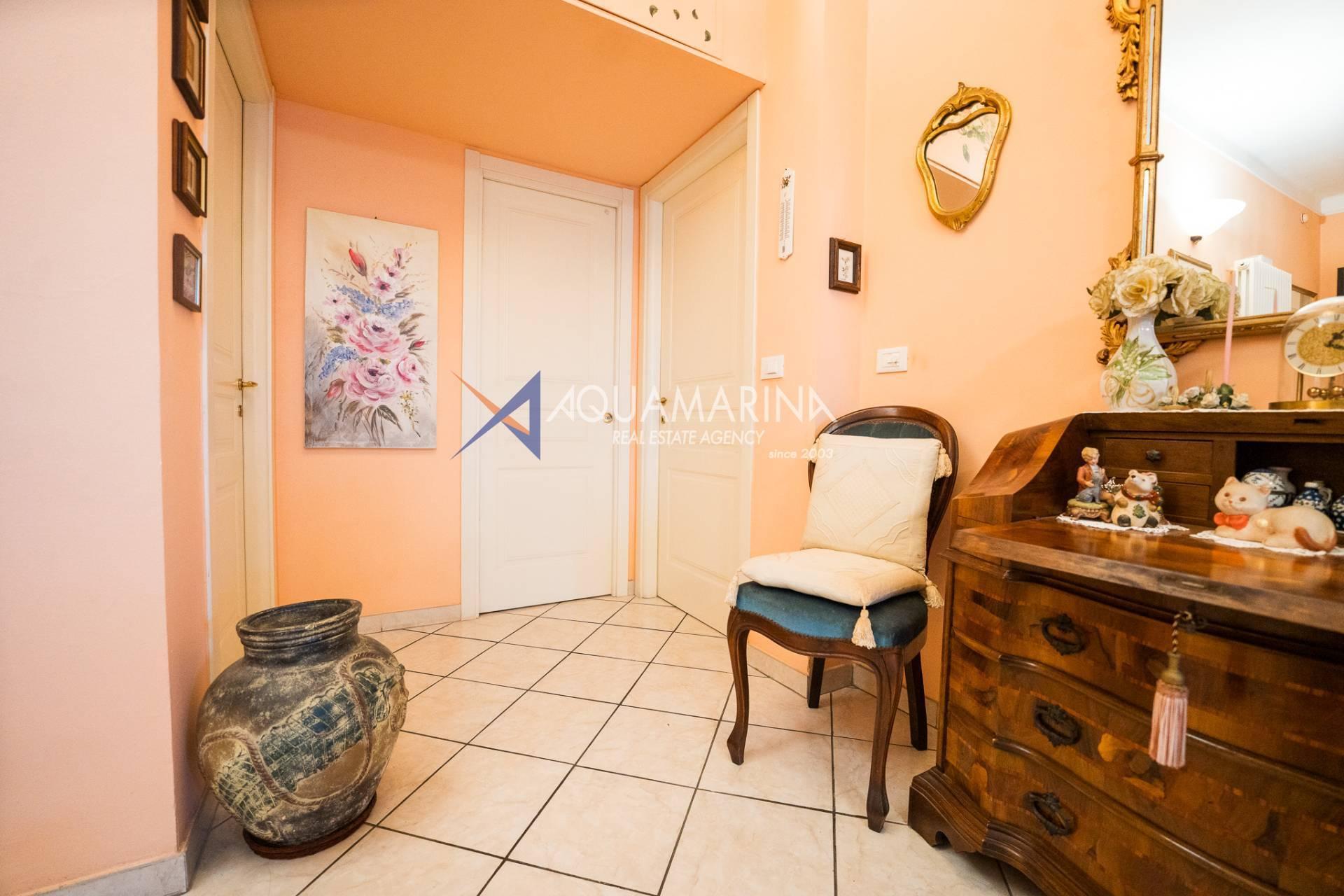 L'appartement comprend un hall d'entrée spacieux, une salle de bains, trois chambres, un séjour lumineux et aéré avec cuisine ouverte, un balcon latéral et une grande terrasse aménagée avec vue sur la mer. Un garage est inclus dans le prix. Le chauffage est individuel grâce à une chaudière au gaz naturel ; l'appartement a été entièrement rénové. Les fenêtres sont en aluminium blanc à double vitrage.