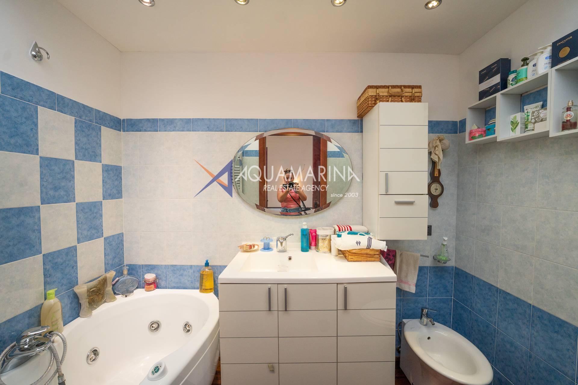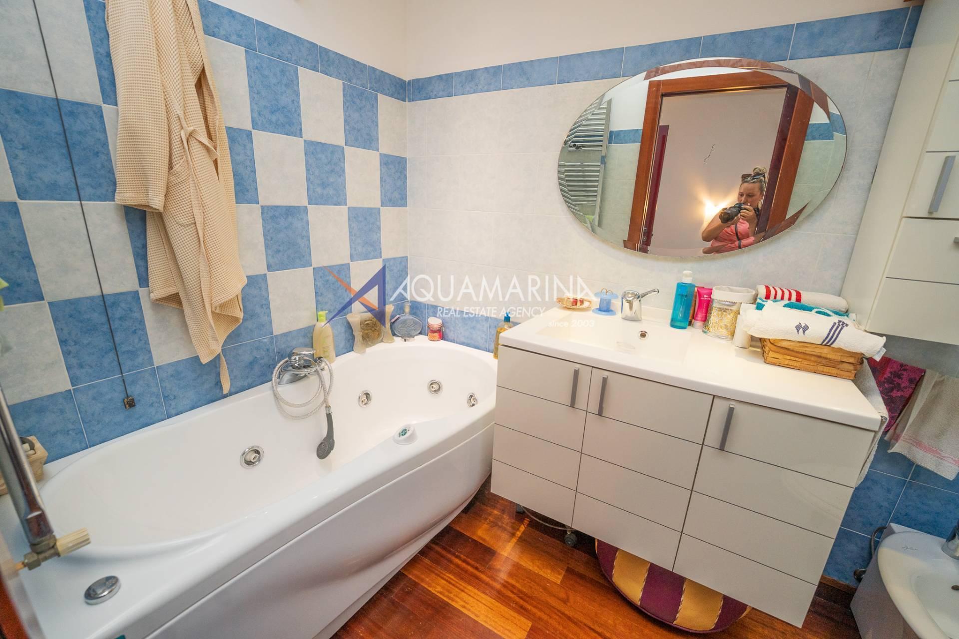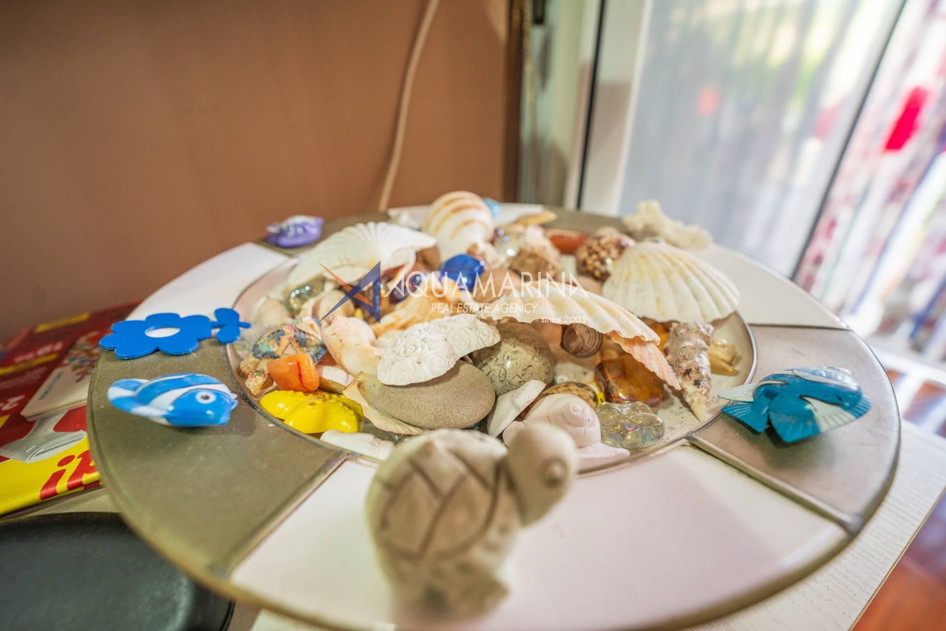 Un escalier intérieur pittoresque mène à l'étage supérieur, où se trouvent deux chambres, une deuxième salle de bain finement finie et deux balcons, dont l'un offre une vue enchanteresse sur la mer.