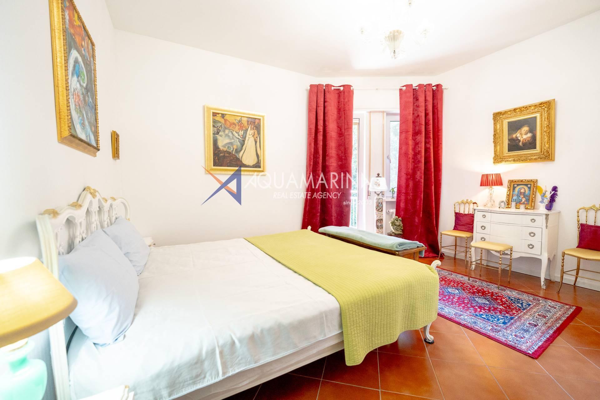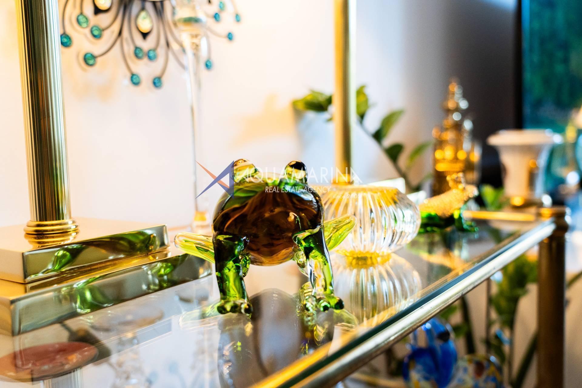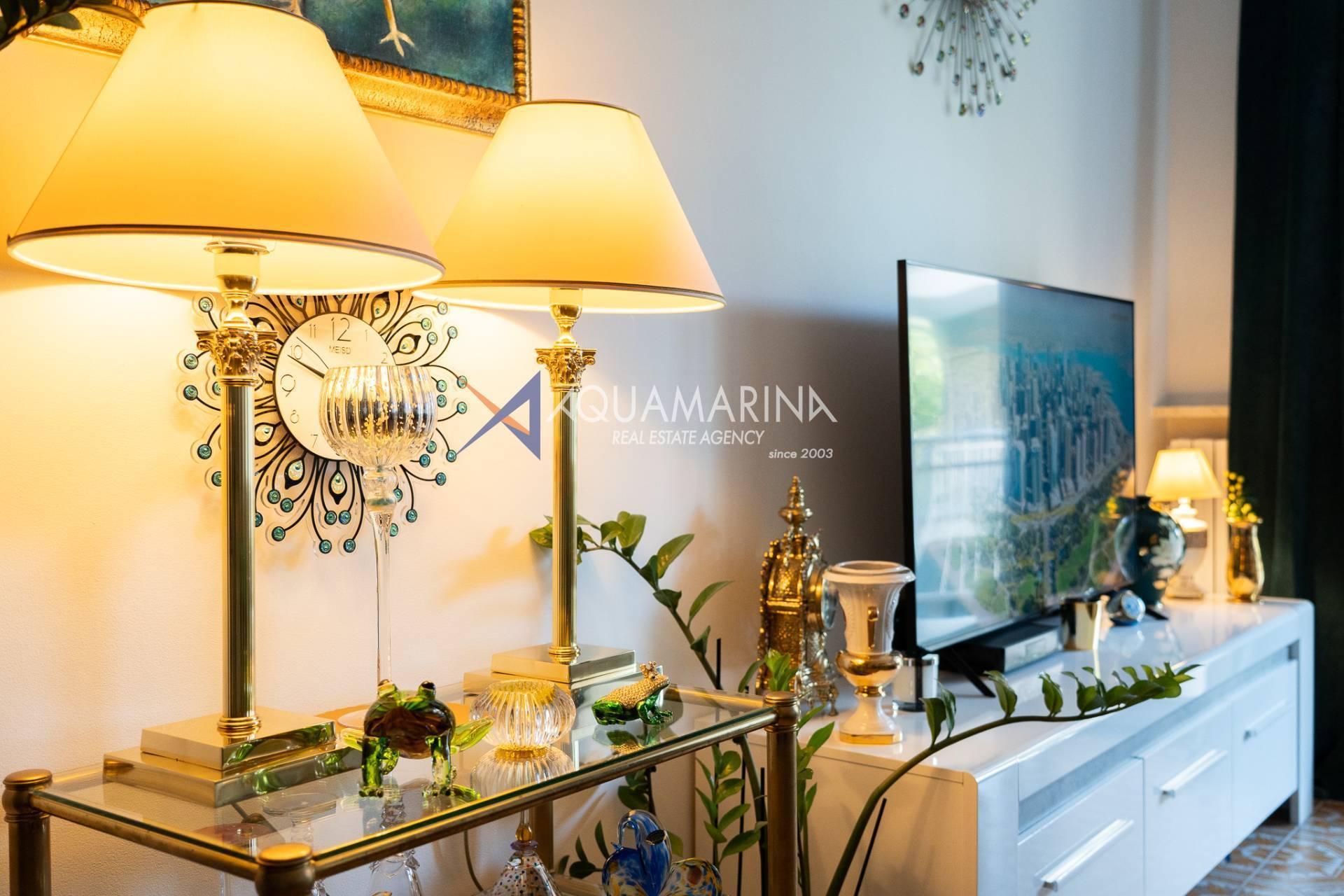 L'entrée, qui s'ouvre sur un séjour lumineux meublé, avec accès à la terrasse, où vous pourrez dîner en plein air et profiter de moments de détente avec une belle vue mer.