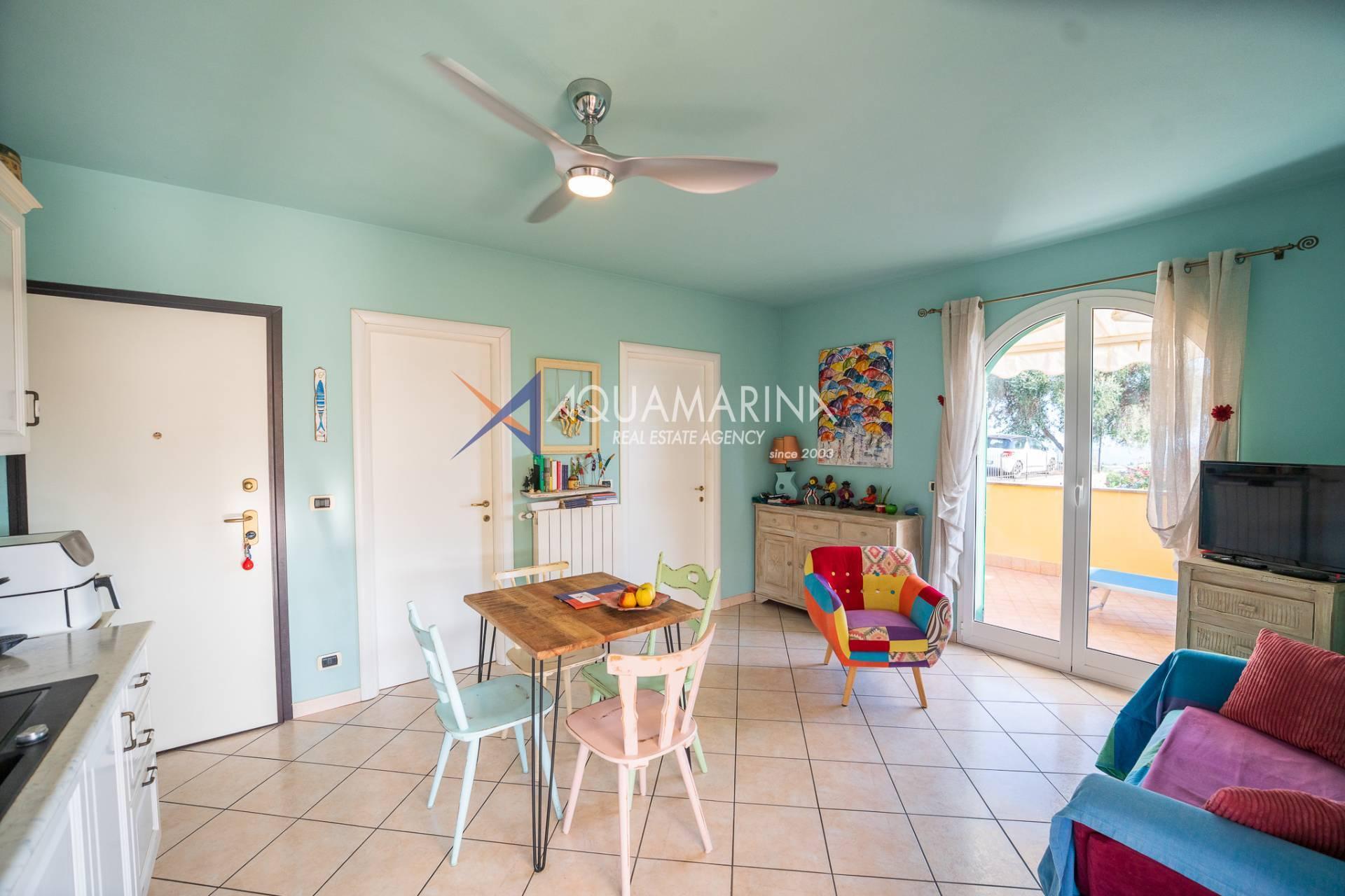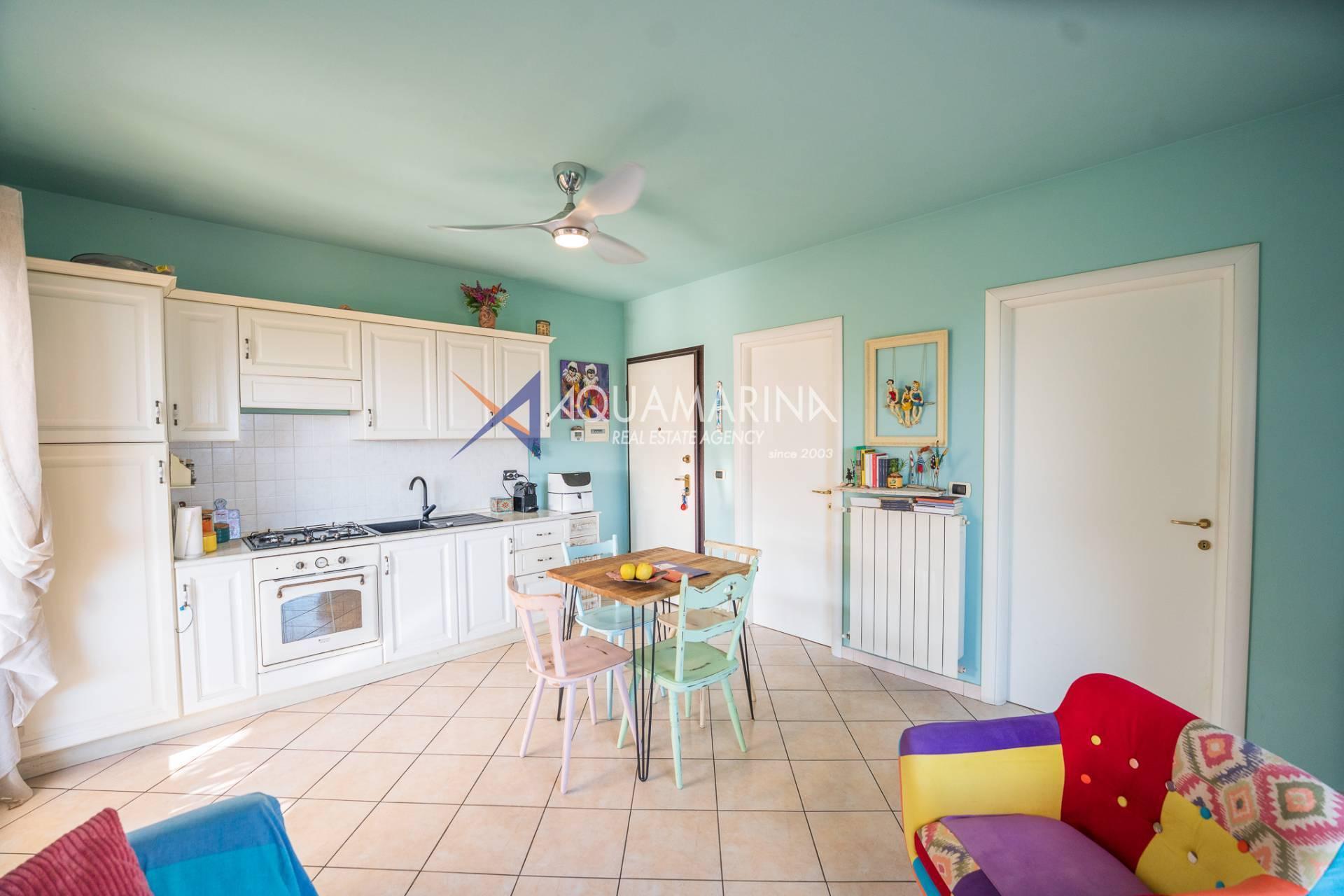 L'entrée s'ouvre sur un séjour lumineux avec kitchenette, suivi d'une chambre double, d'une salle de bains avec fenêtre et de deux grandes terrasses avec vue sur la mer, idéales pour se détendre ou dîner en plein air. La propriété comprend également une cave pratique et la possibilité de garer une ou plusieurs voitures dans les espaces communs.