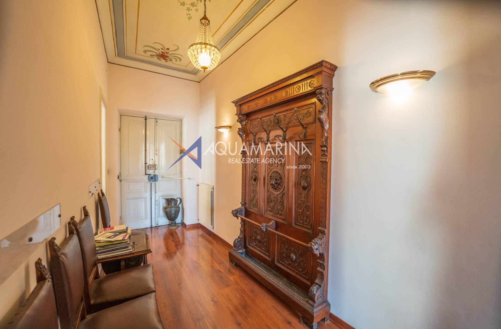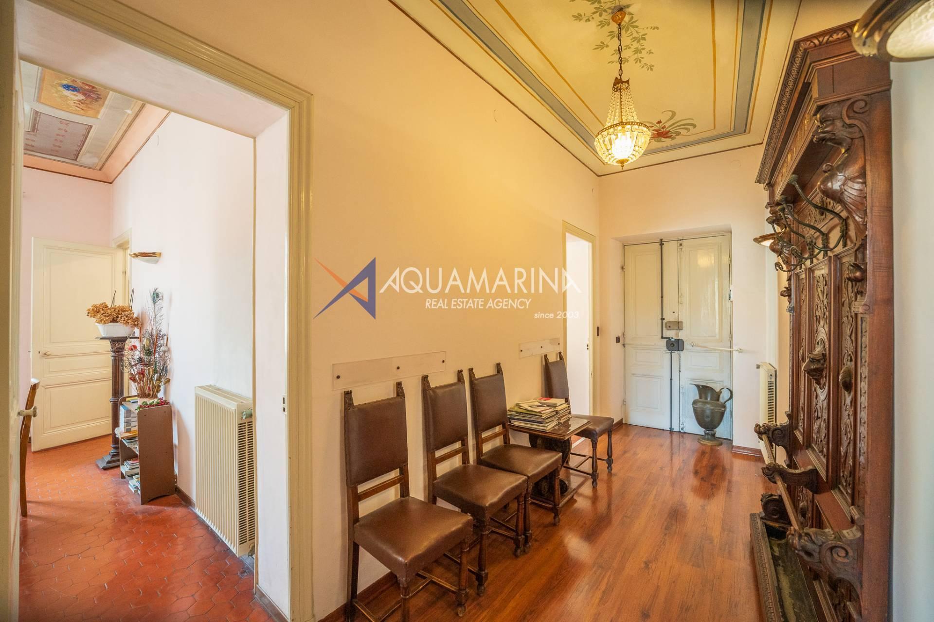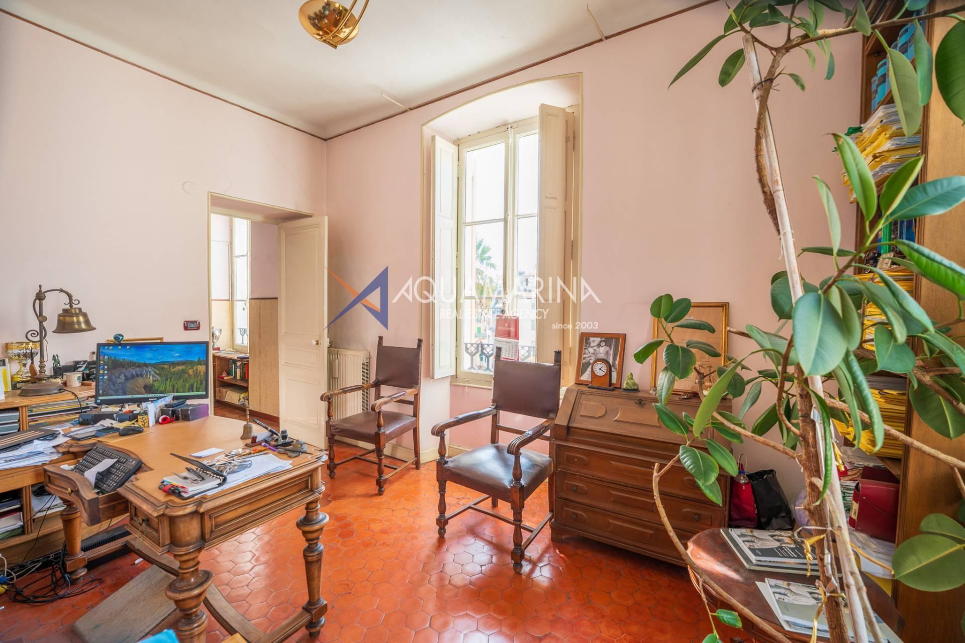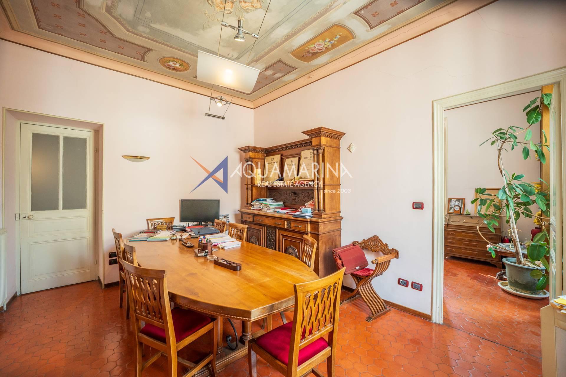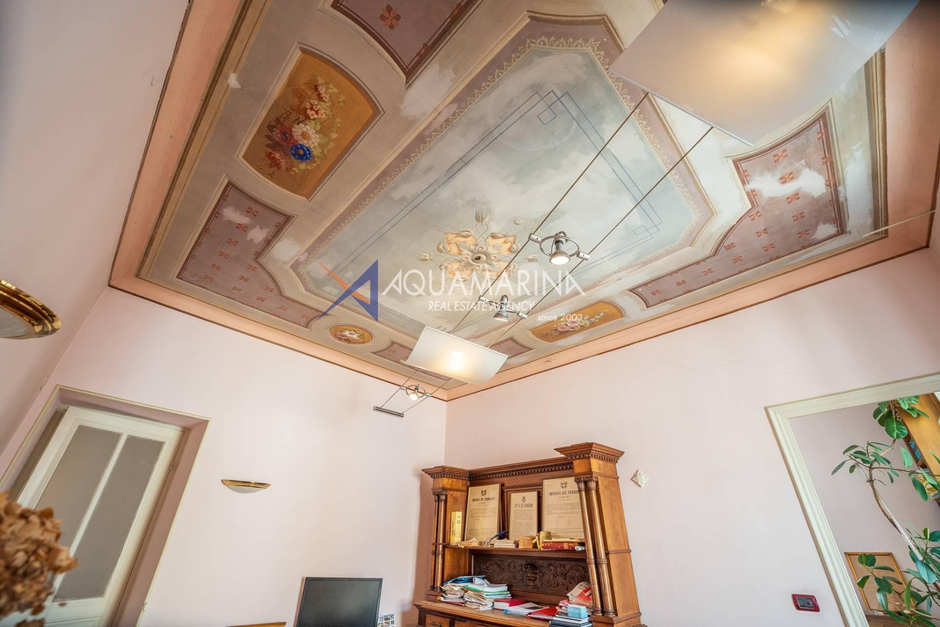 La propriété est dans son état d'origine et conserve tout le charme de l'époque, avec de hauts plafonds ornés de fresques, une agréable vue dégagée, des fenêtres donnant également sur le Corso Mombello et un aperçu suggestif de la mer à l'ouest.