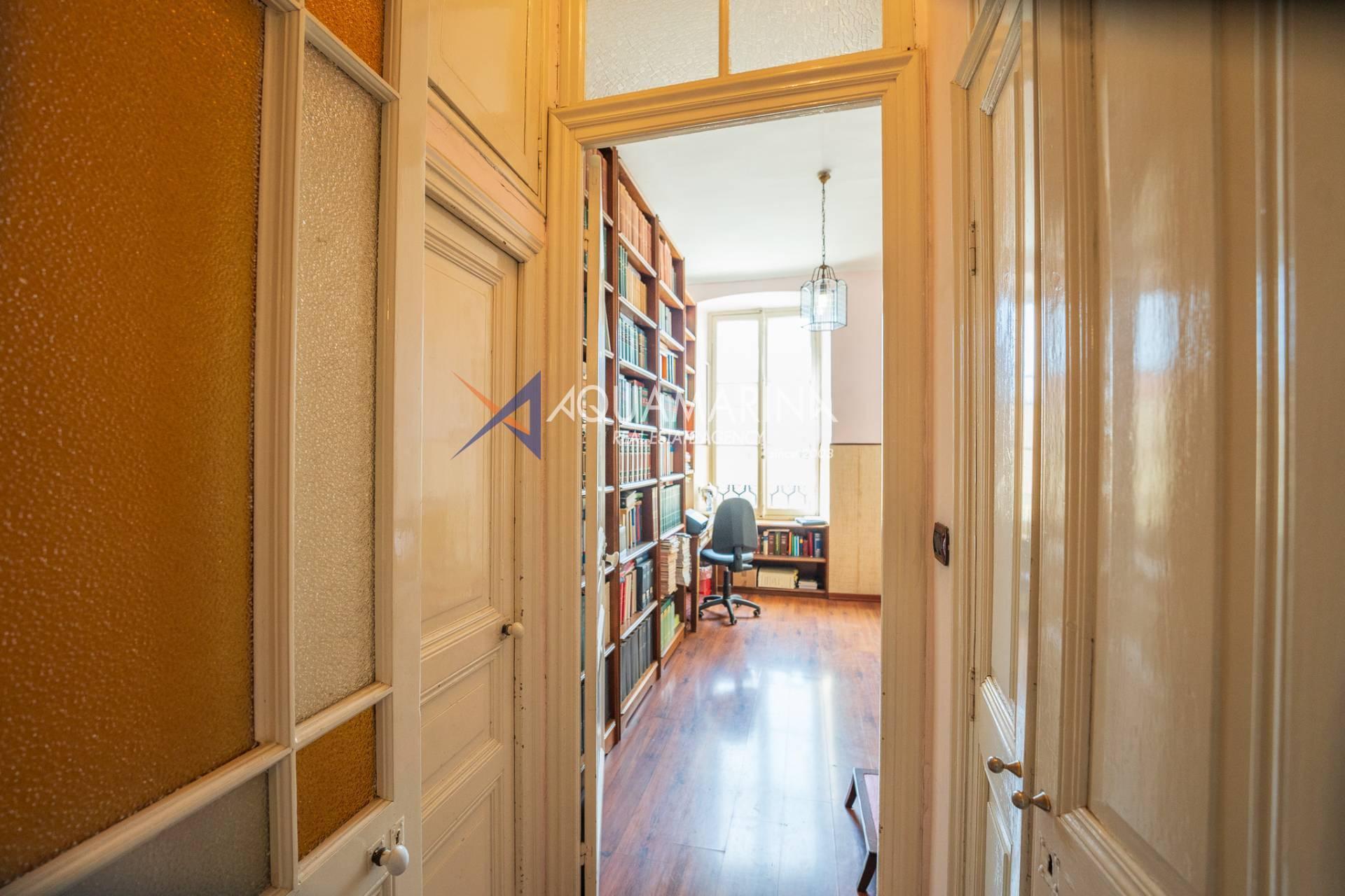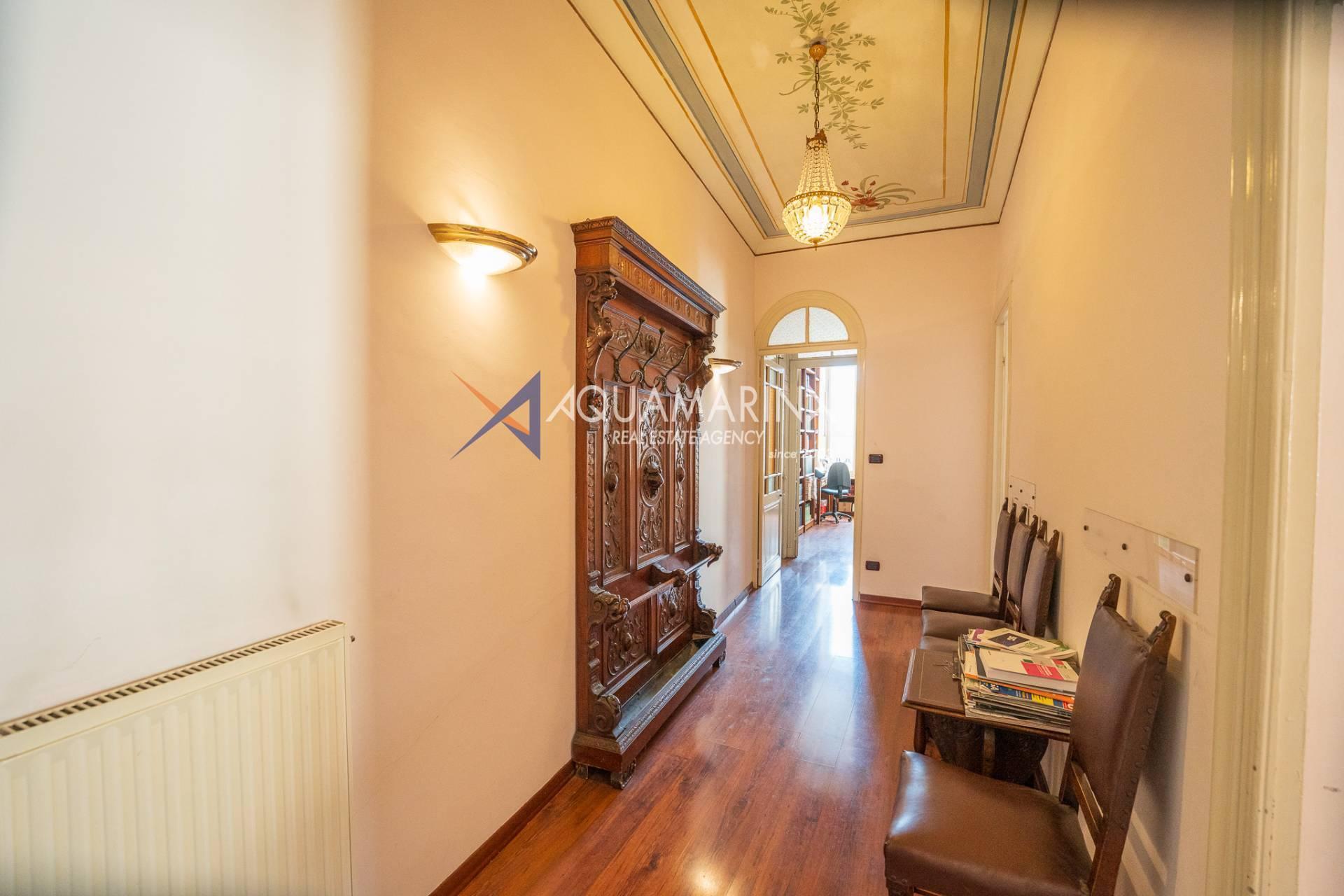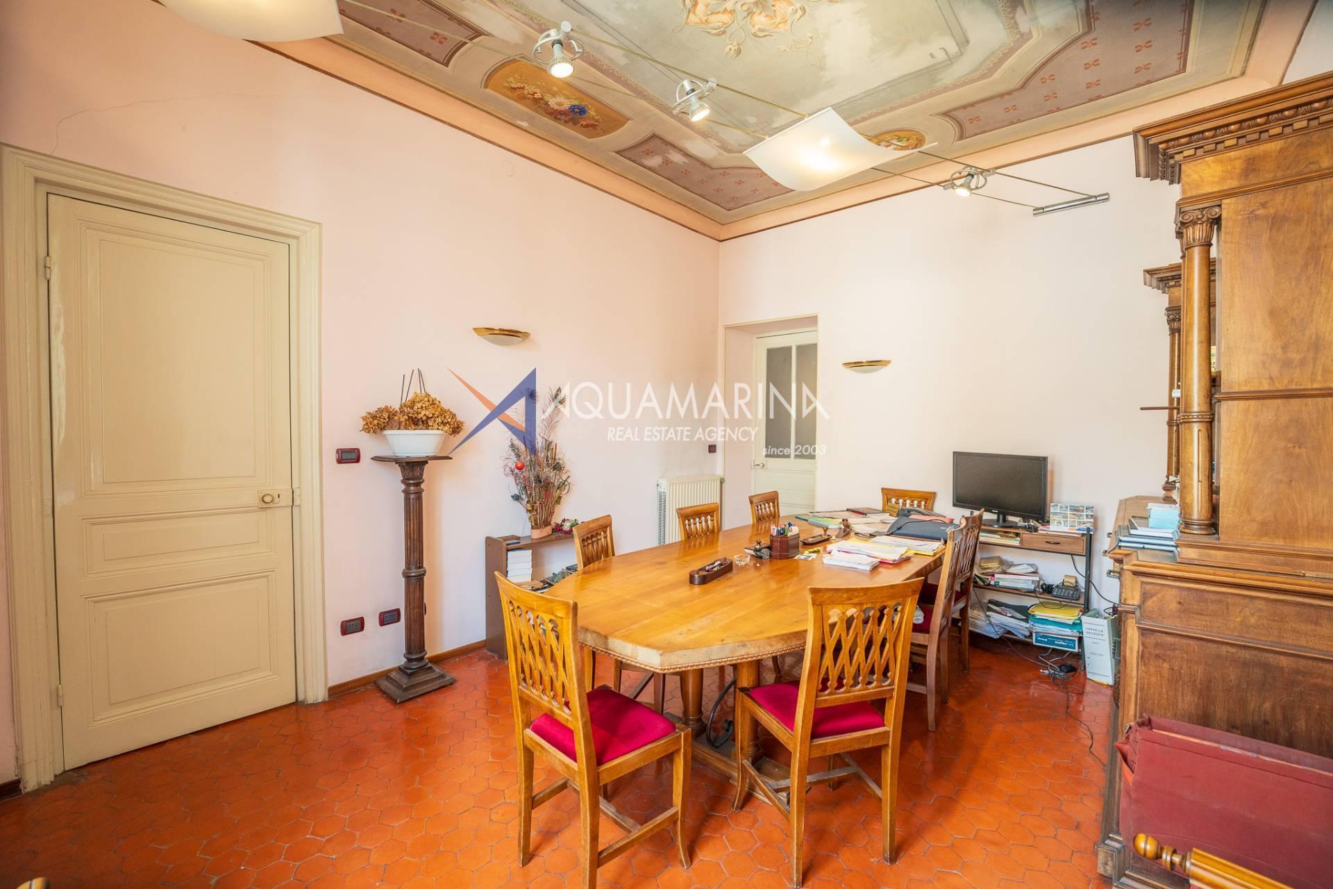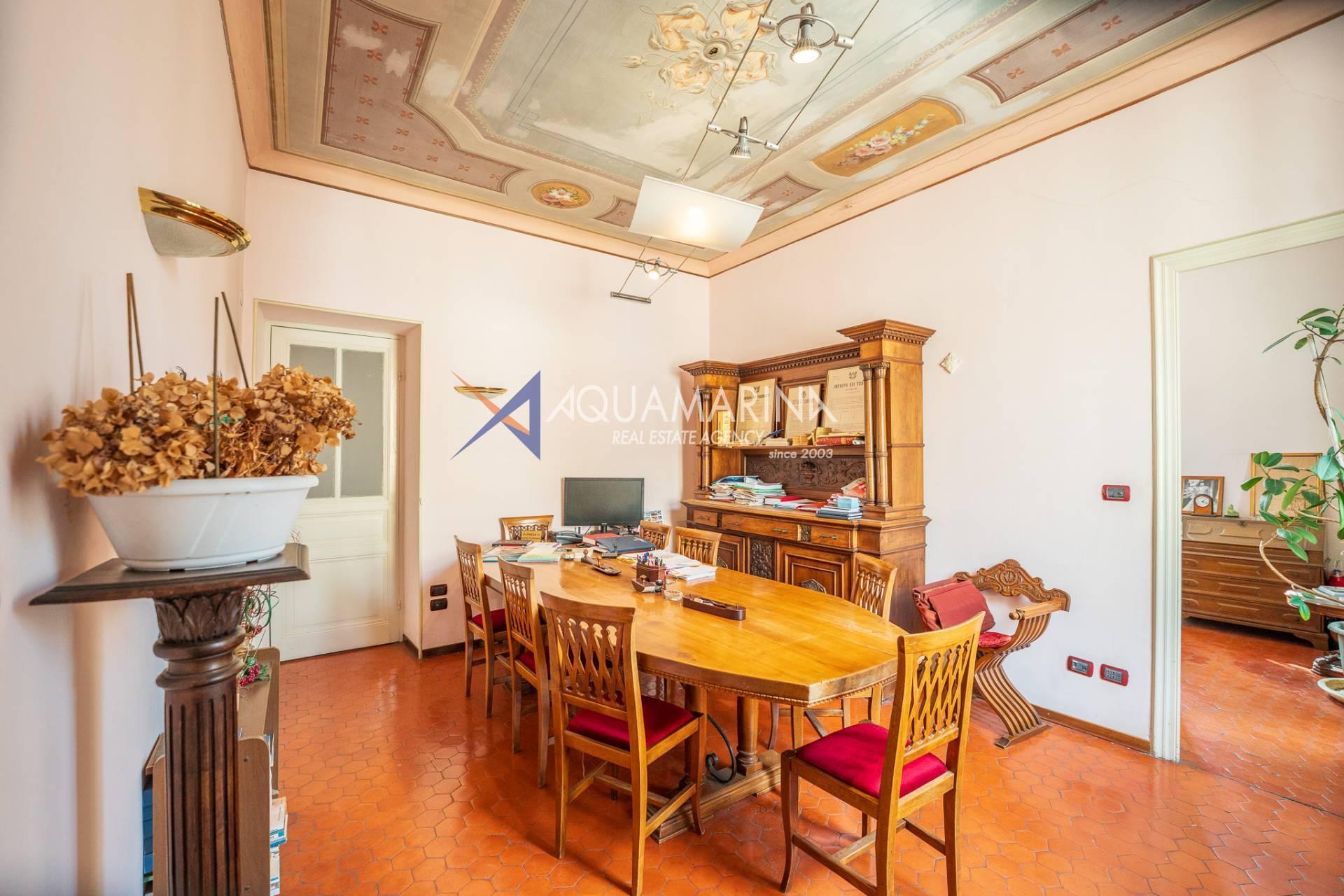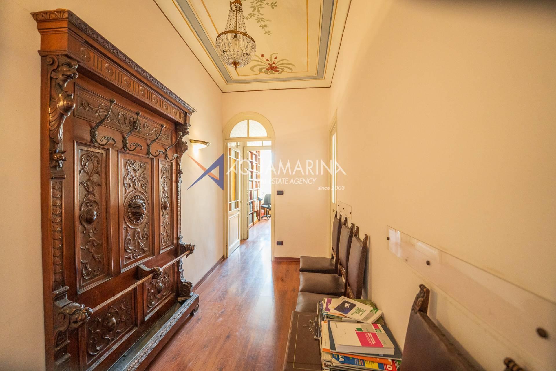 La propriété est dans son état d'origine et conserve tout le charme de l'époque, avec de hauts plafonds ornés de fresques, une agréable vue dégagée, des fenêtres donnant également sur le Corso Mombello et un aperçu suggestif de la mer à l'ouest.