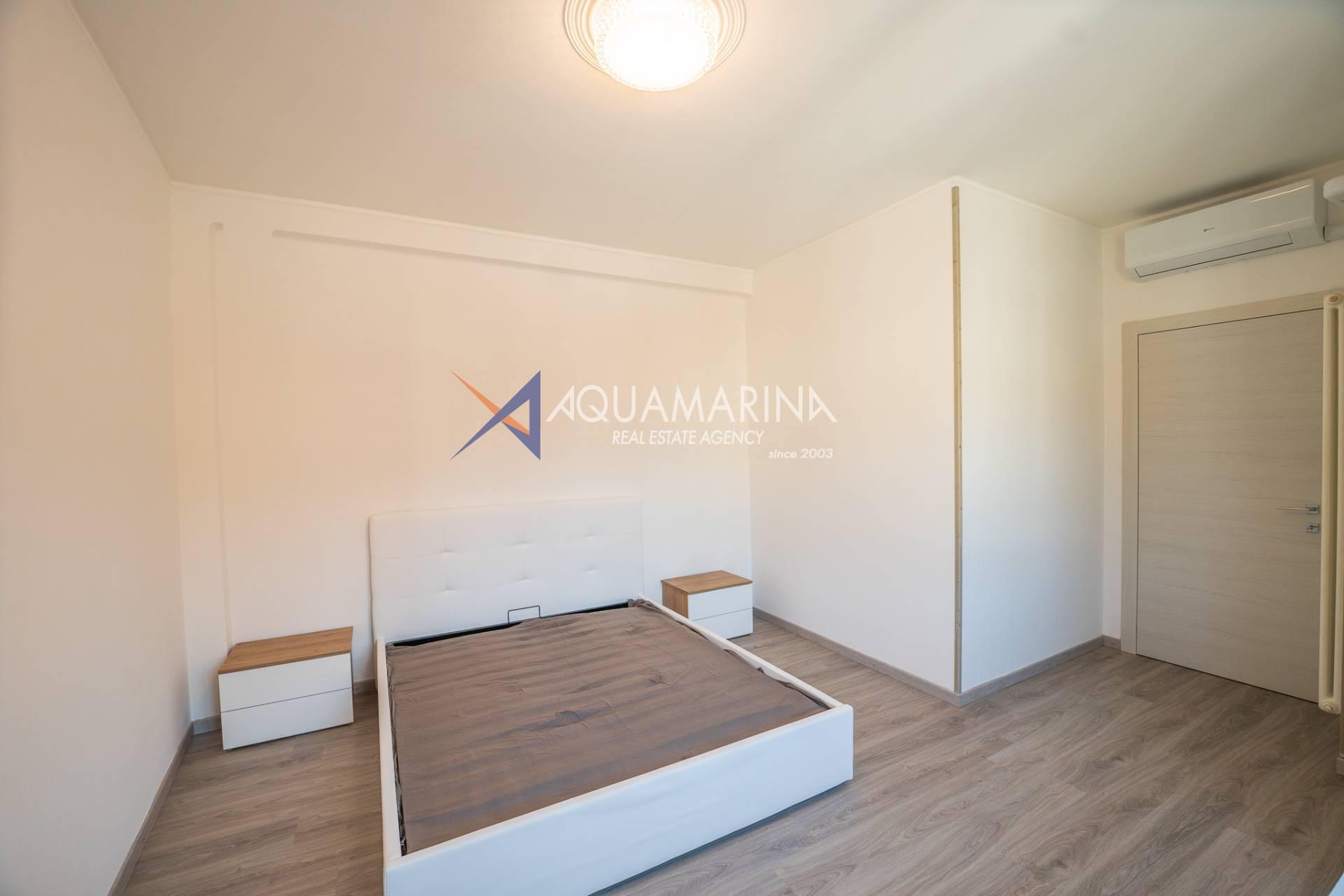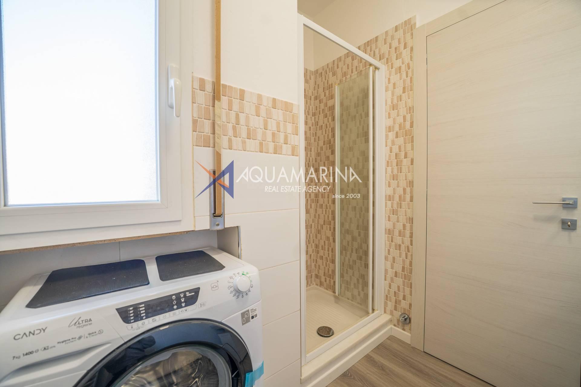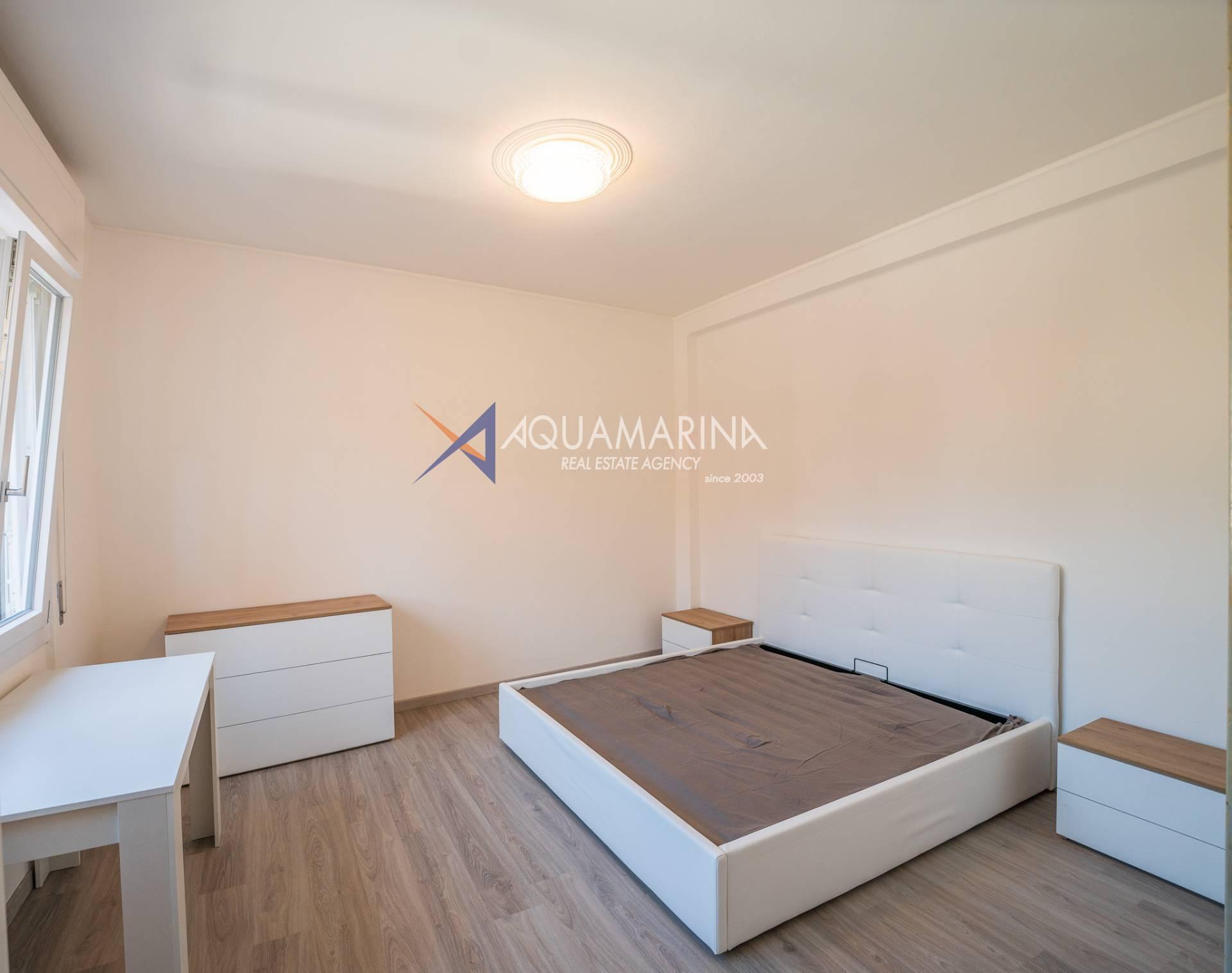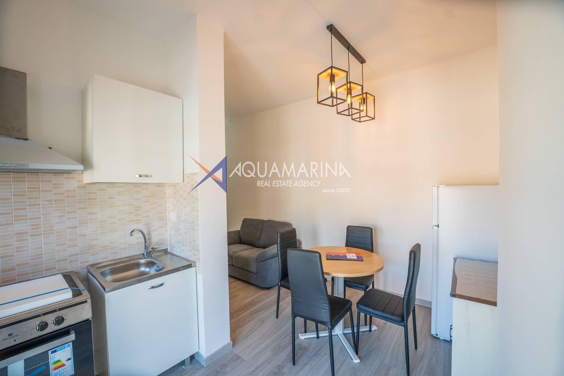 L'appartement comprend un hall d'entrée avec porte blindée, une grande chambre, une salle de bains avec fenêtre et un séjour avec kitchenette ouverte donnant sur un balcon avec vue sur la mer. Il est équipé d'un chauffage individuel, d'une climatisation moderne et d'une chaudière à gaz de dernière génération.