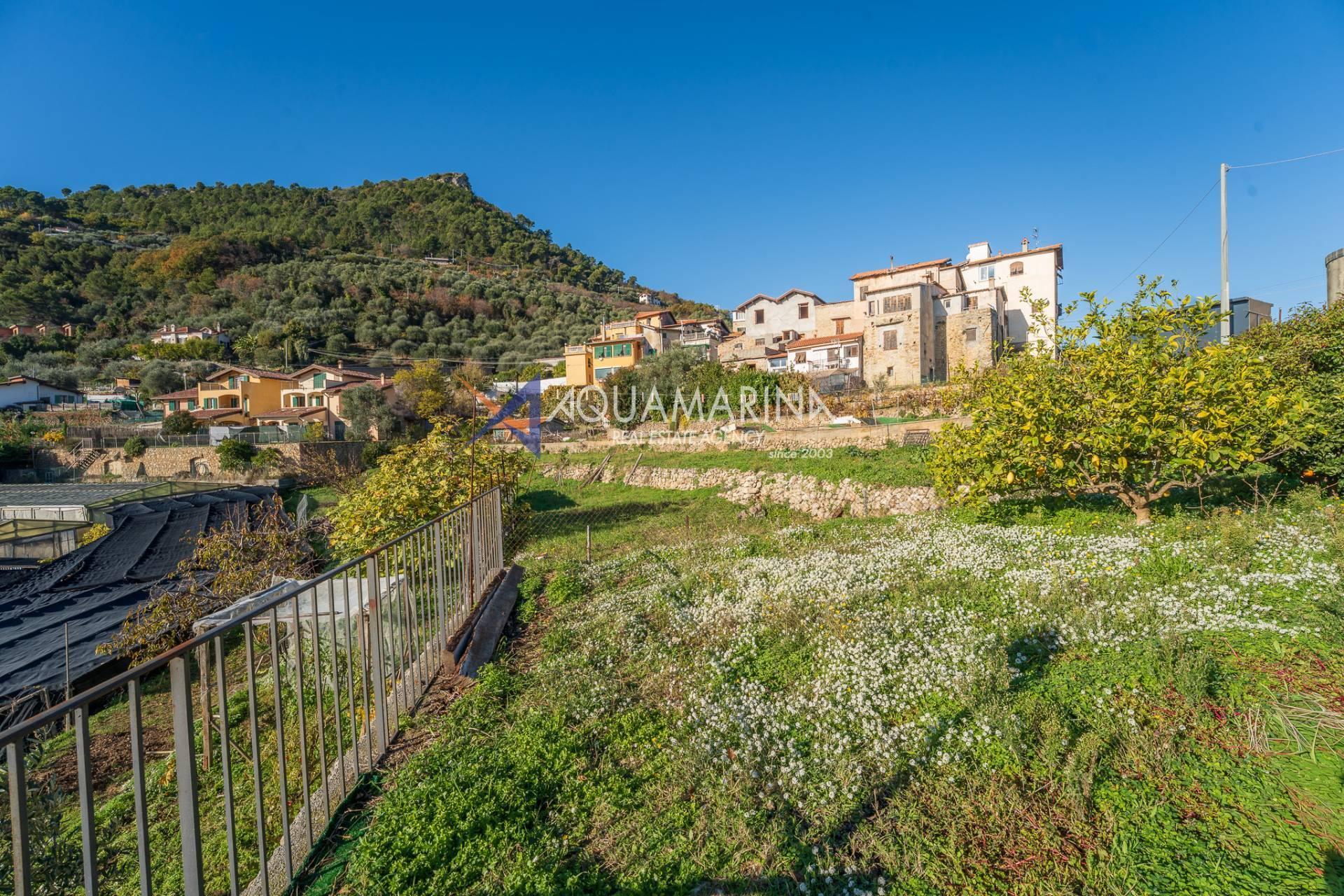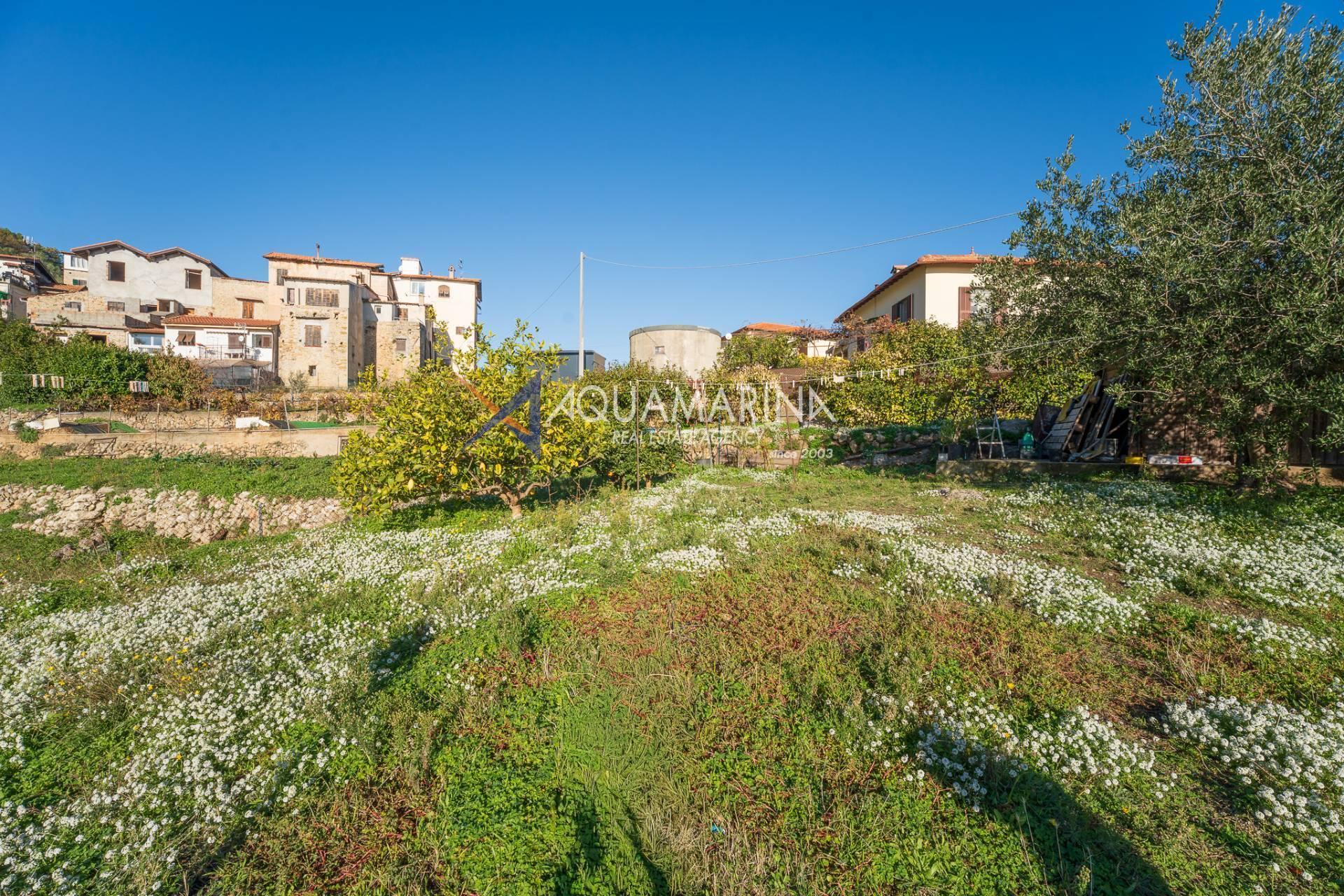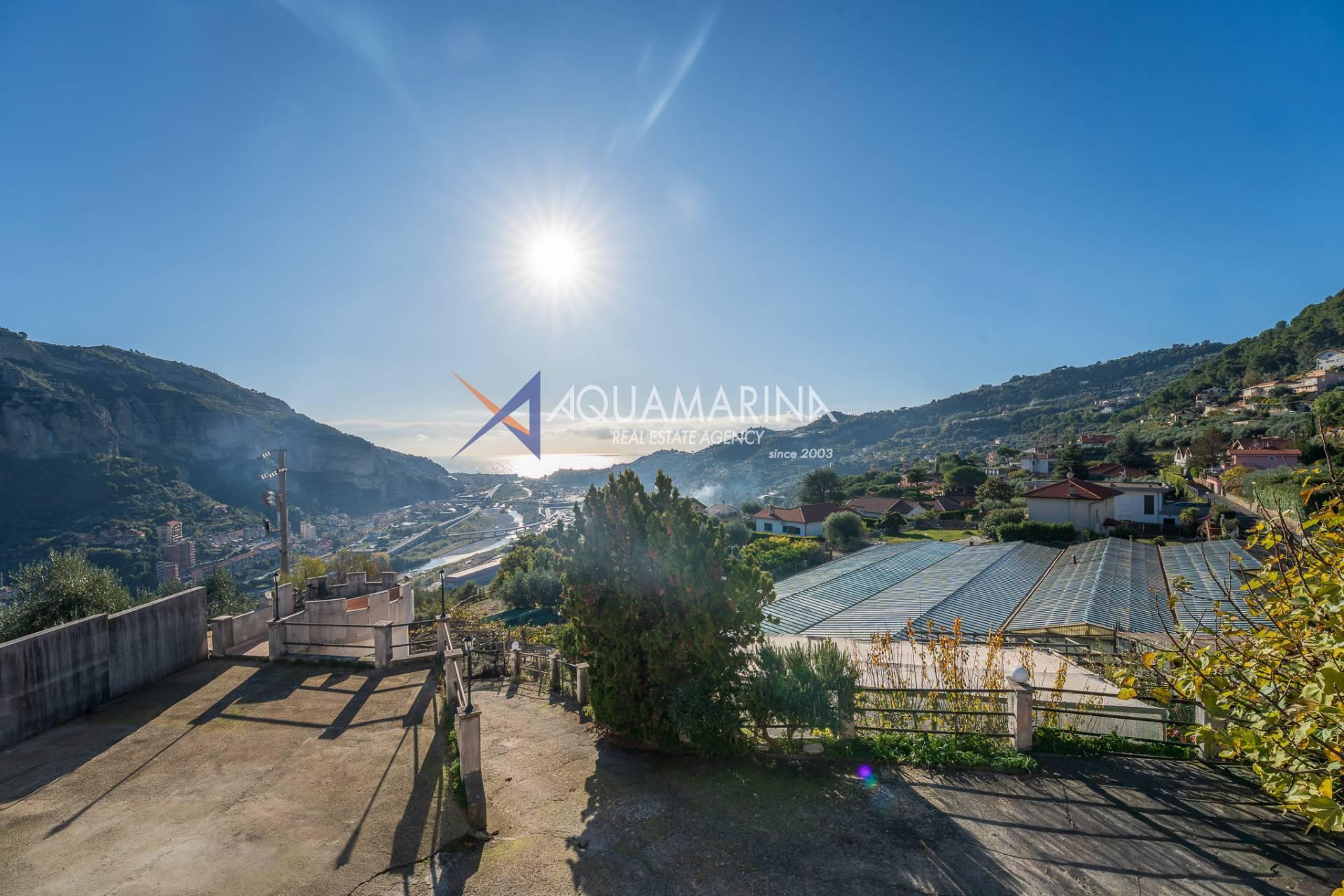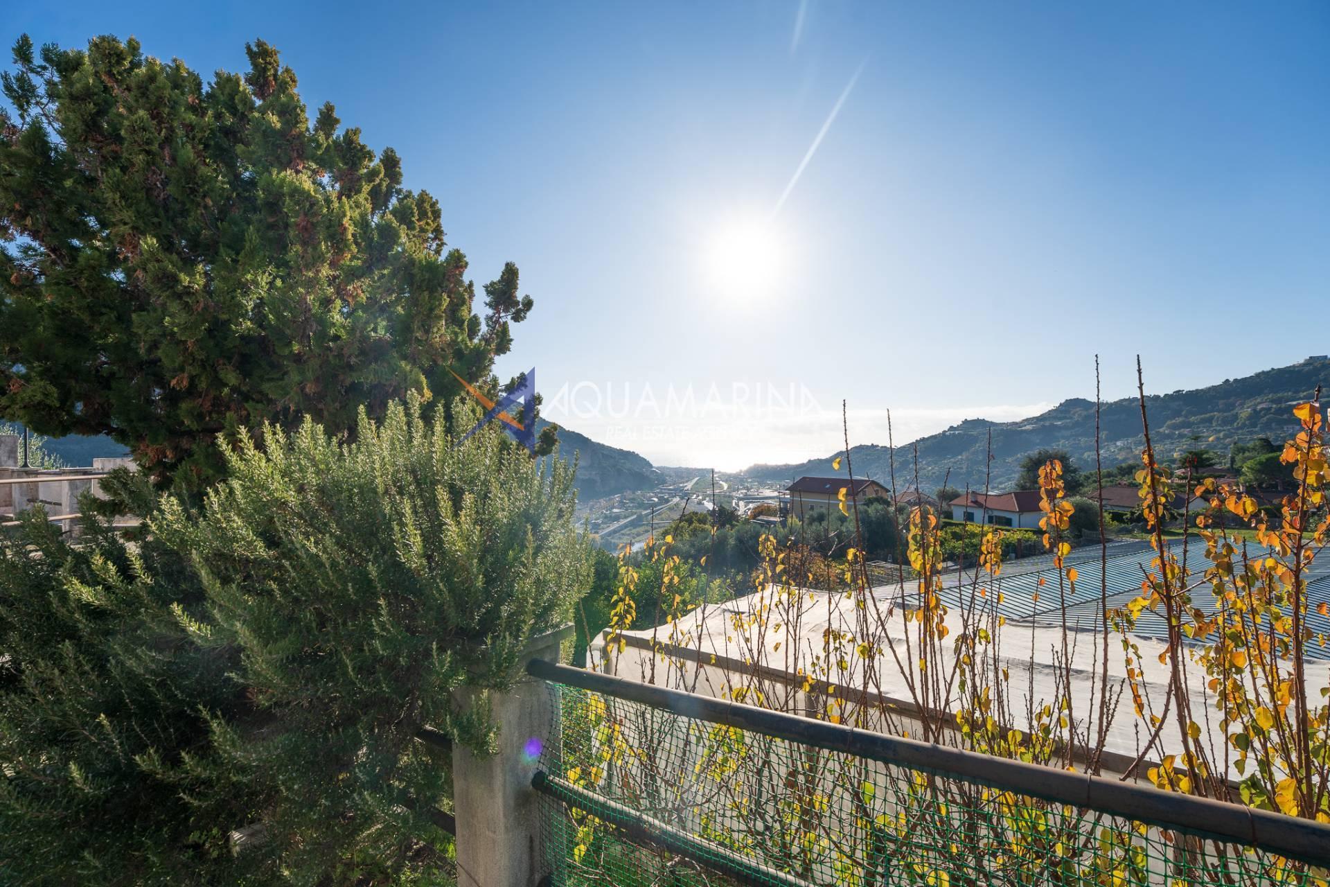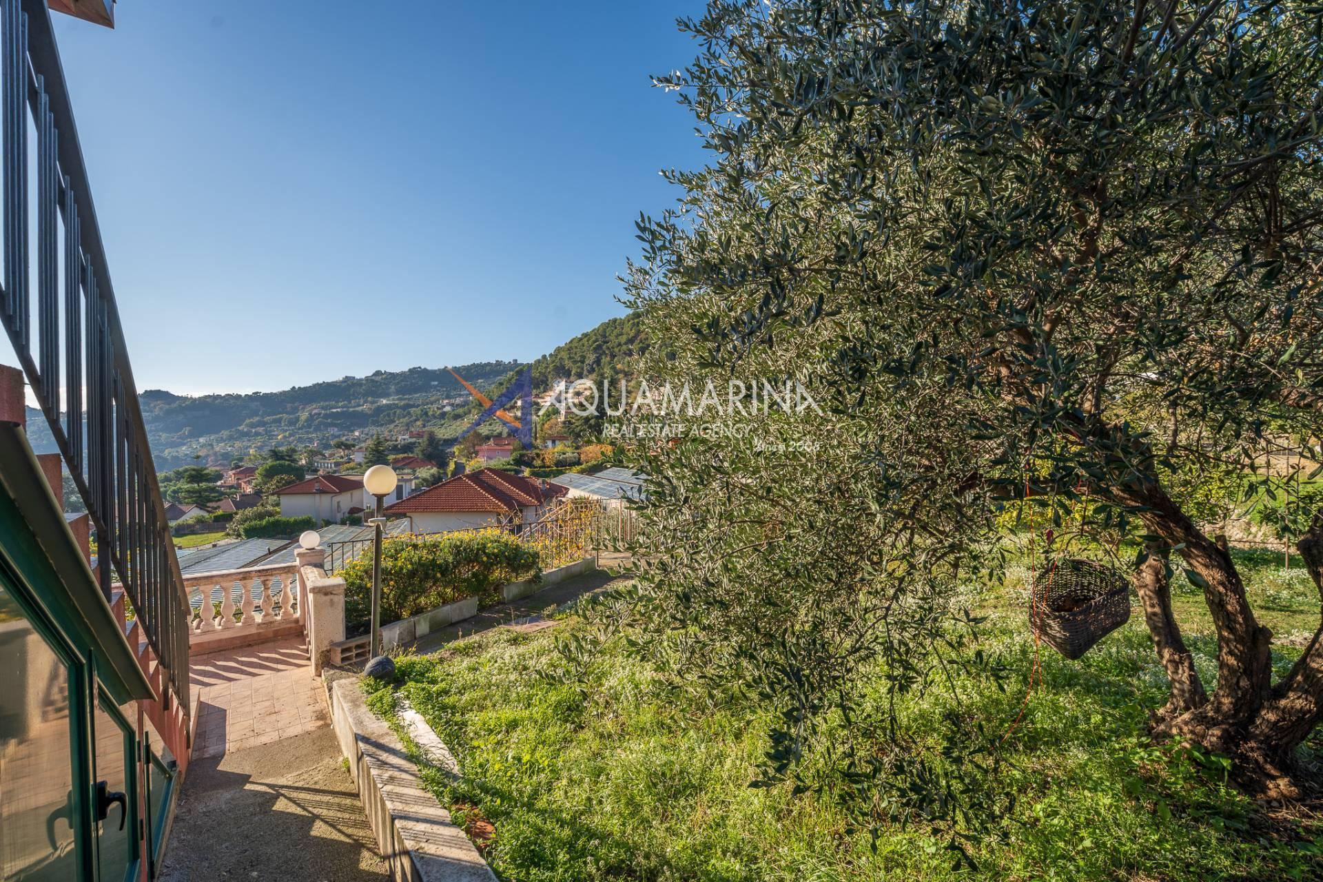 La villa est entourée d'un terrain d'environ 2 500 m², actuellement en partie utilisé comme potager, et de grandes terrasses à l'avant et sur les côtés offrant une vue splendide sur les montagnes et la mer.