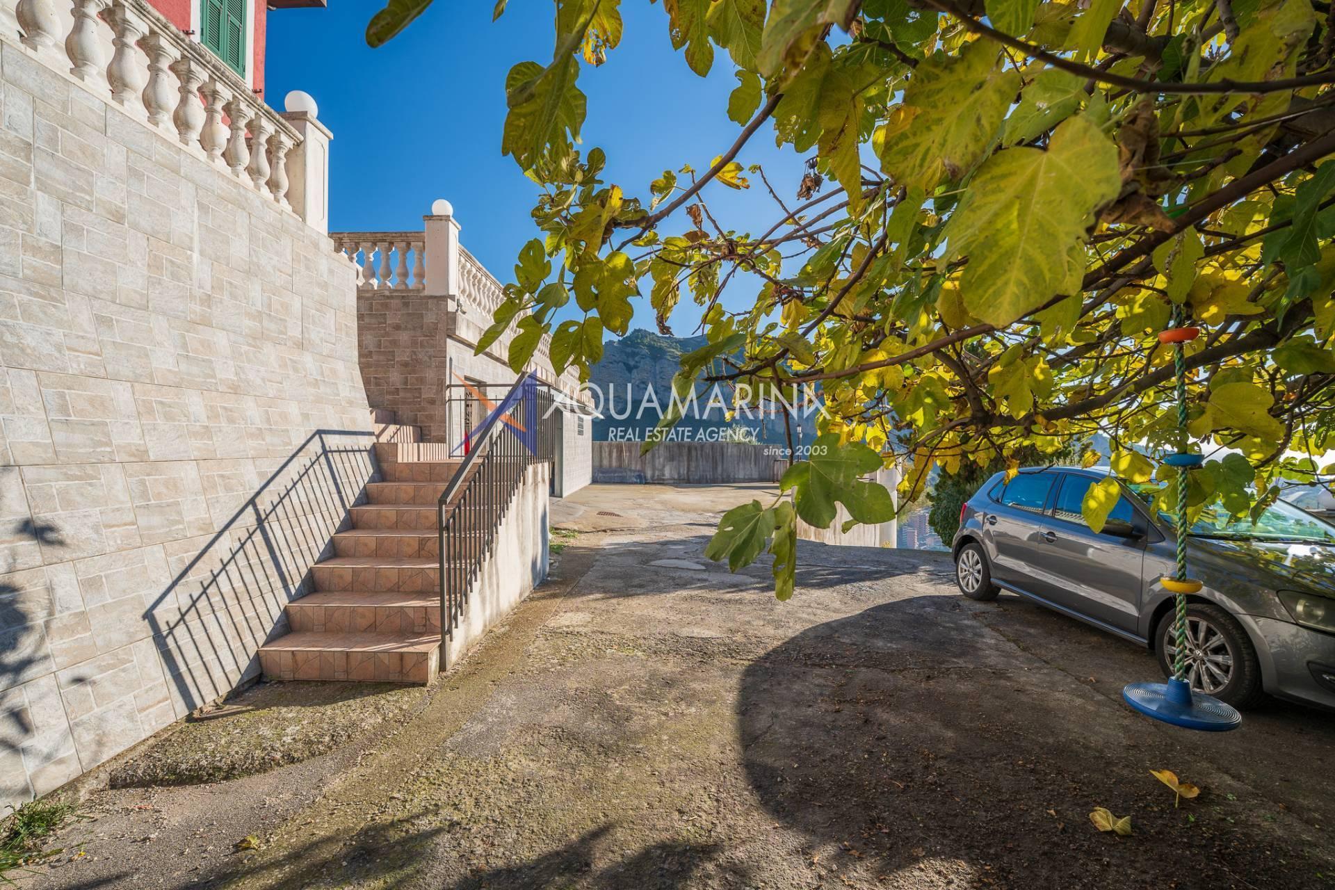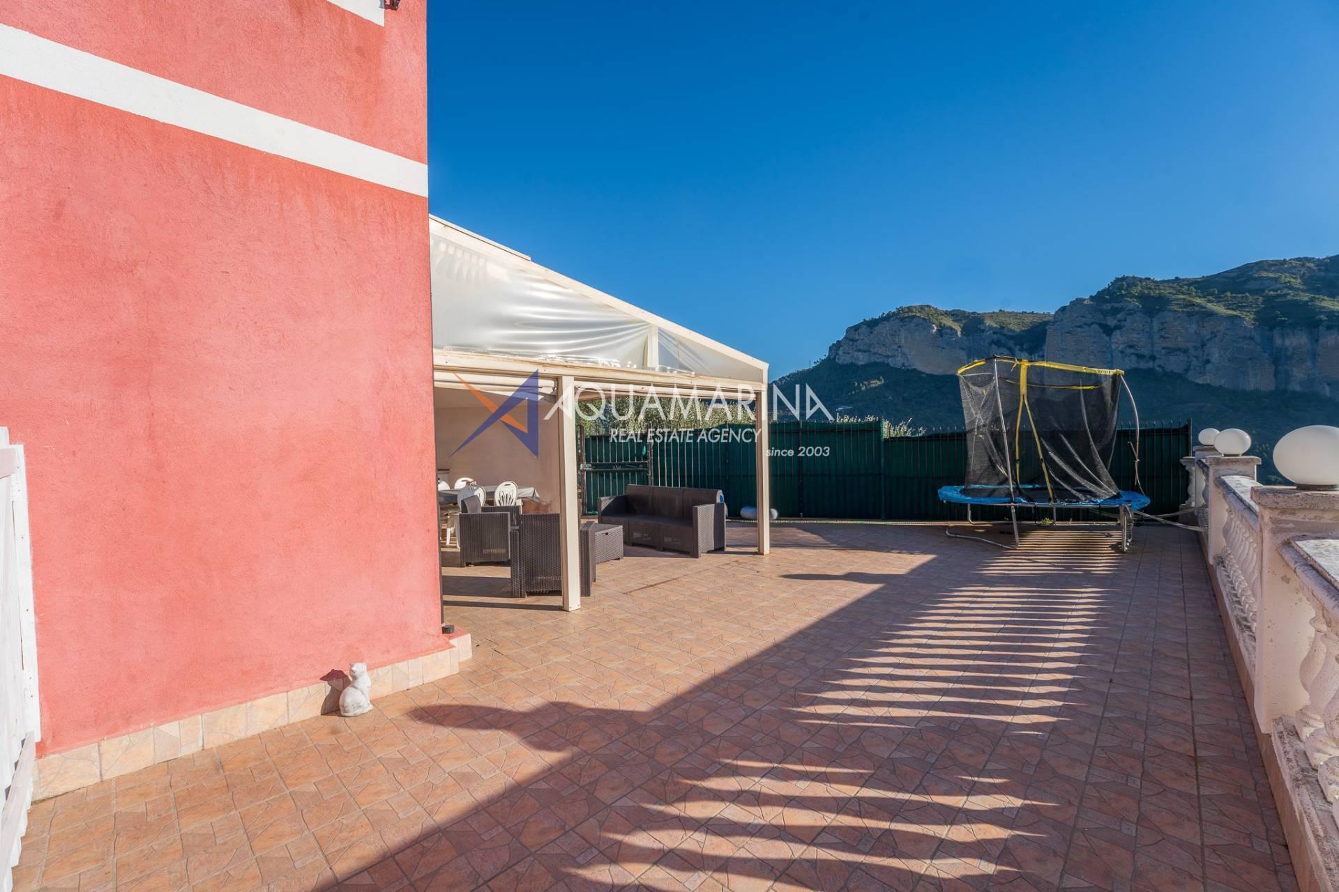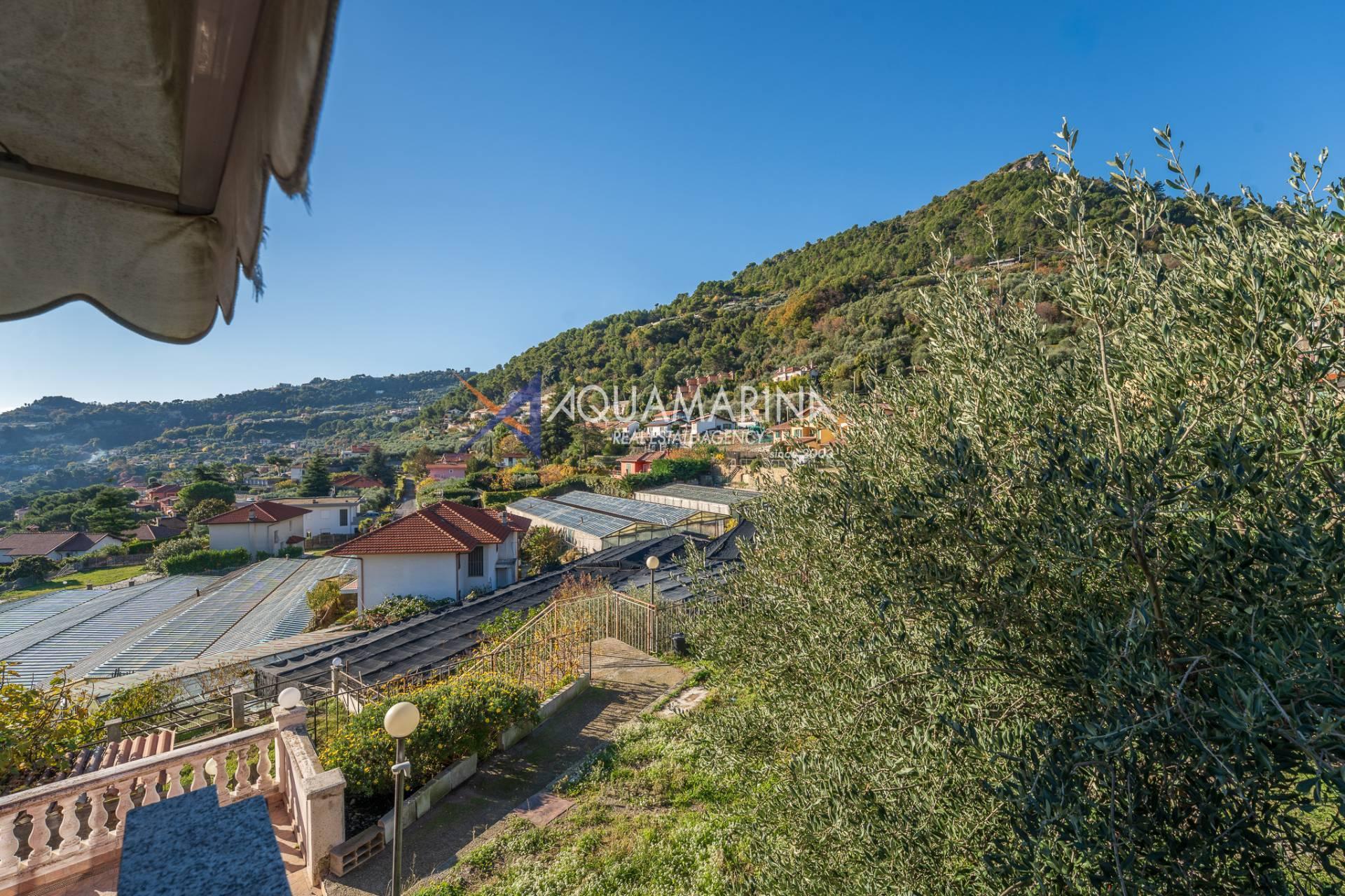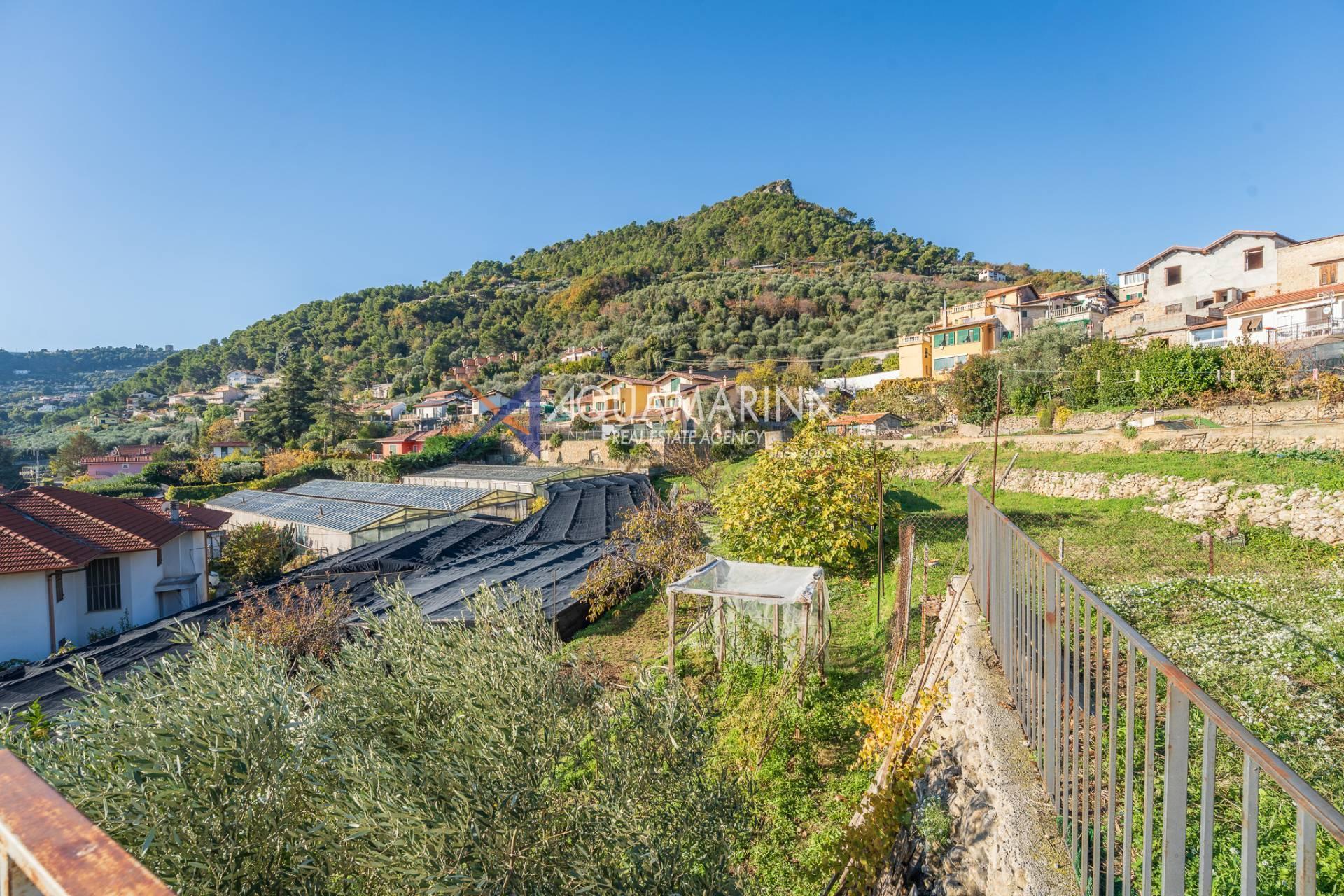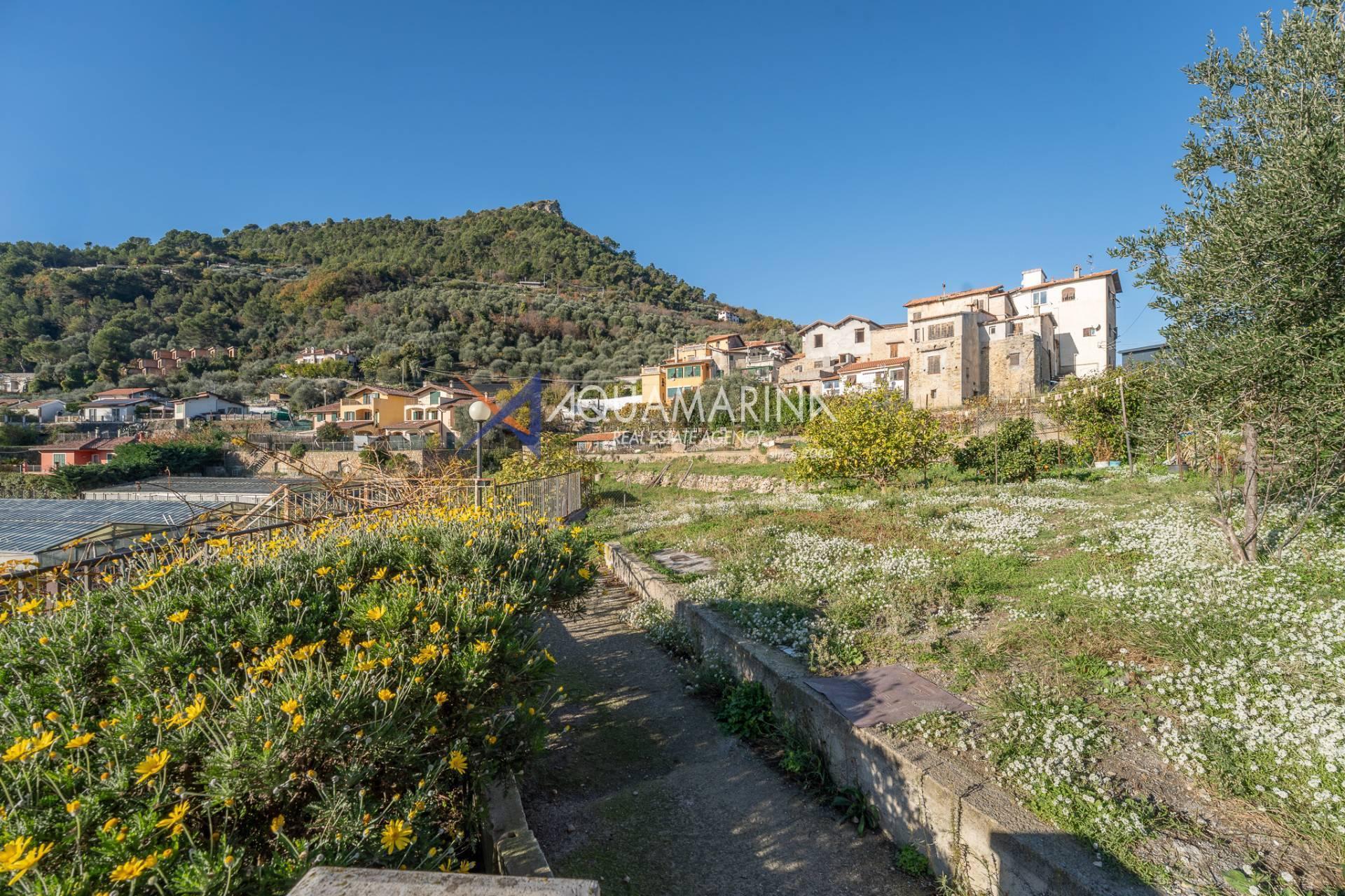 La villa est entourée d'un terrain d'environ 2 500 m², actuellement en partie utilisé comme potager, et de grandes terrasses à l'avant et sur les côtés offrant une vue splendide sur les montagnes et la mer.