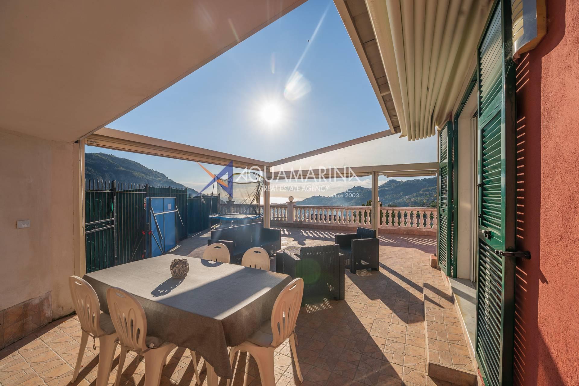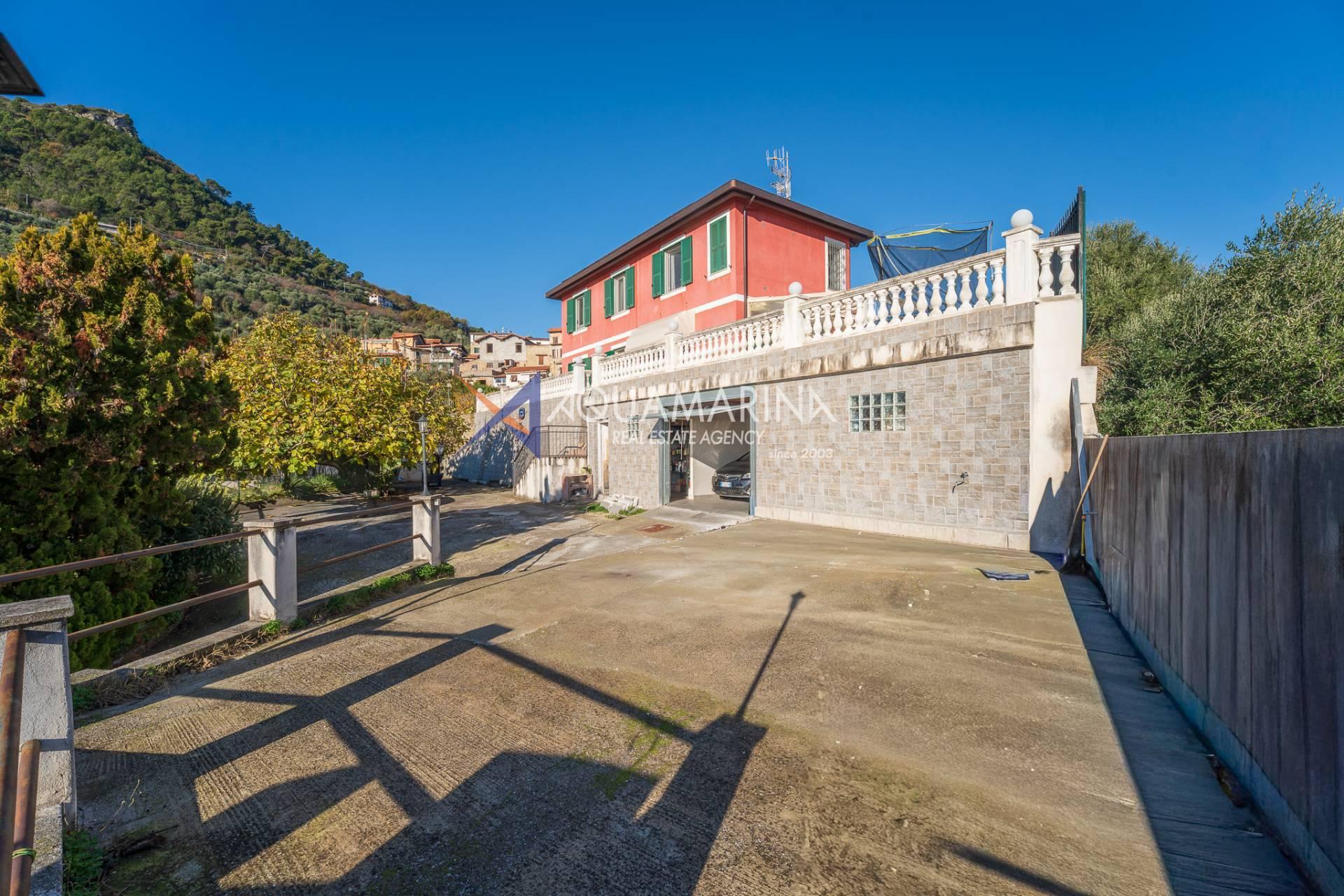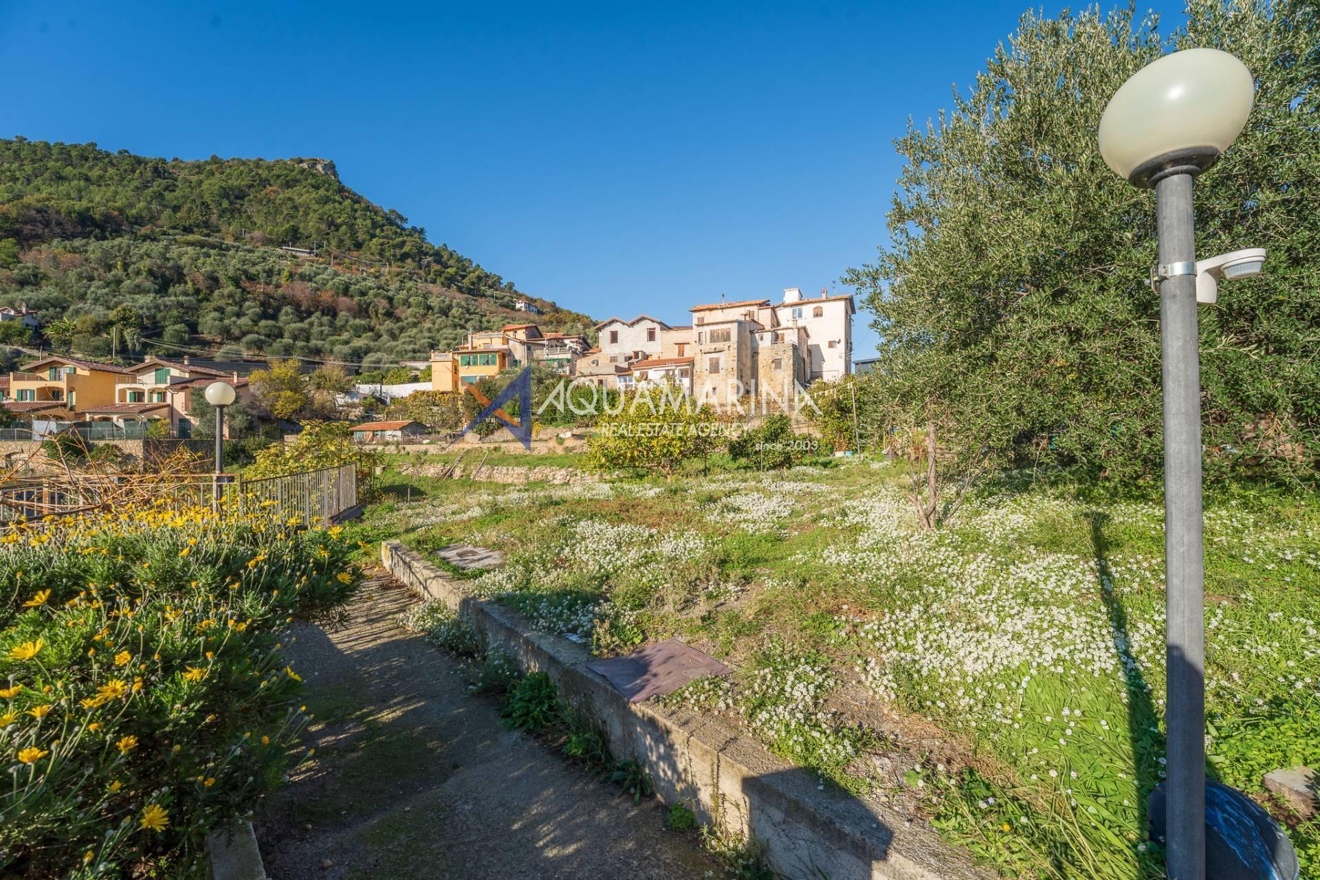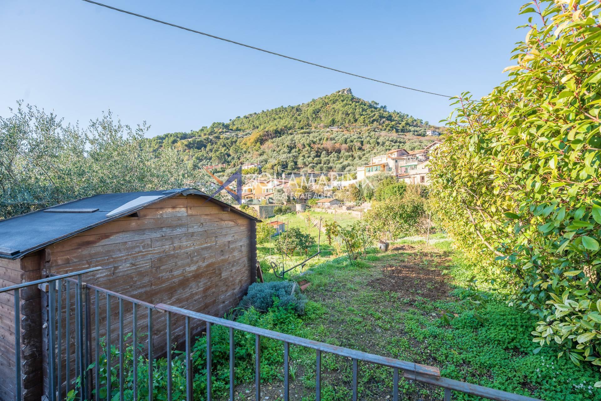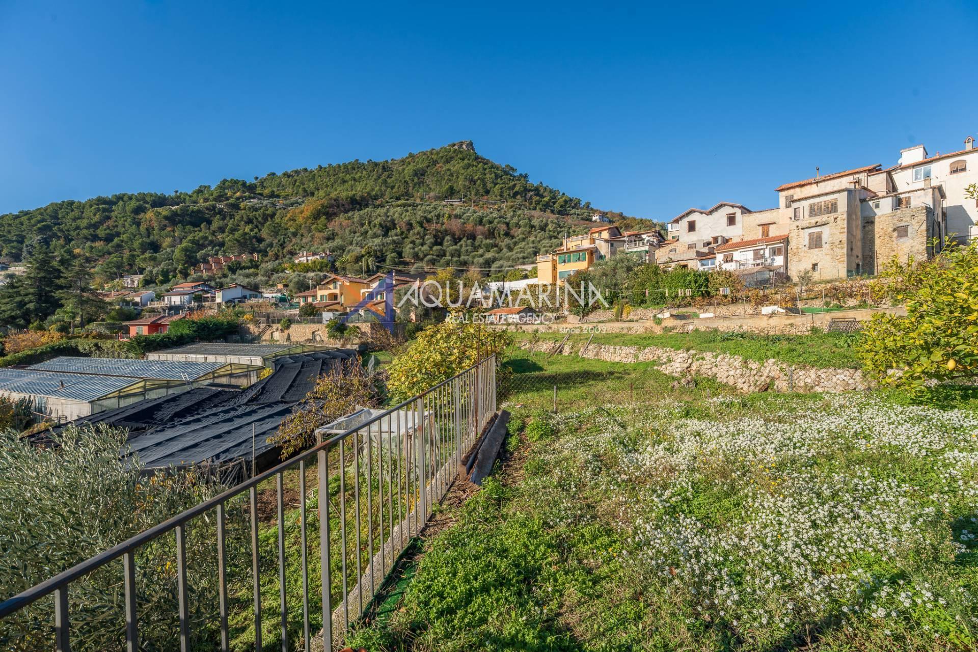 La villa est entourée d'un terrain d'environ 2 500 m², actuellement en partie utilisé comme potager, et de grandes terrasses à l'avant et sur les côtés offrant une vue splendide sur les montagnes et la mer.