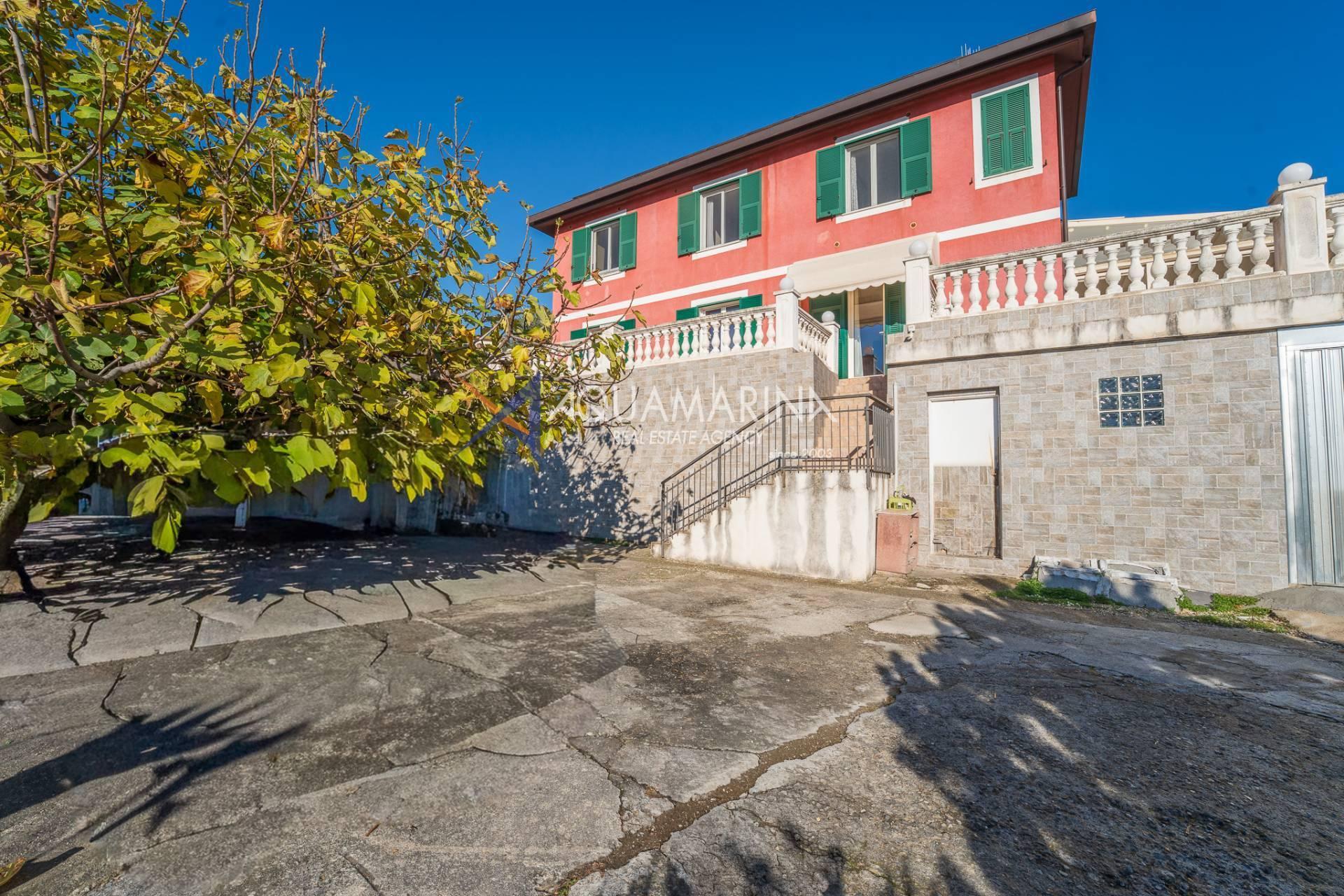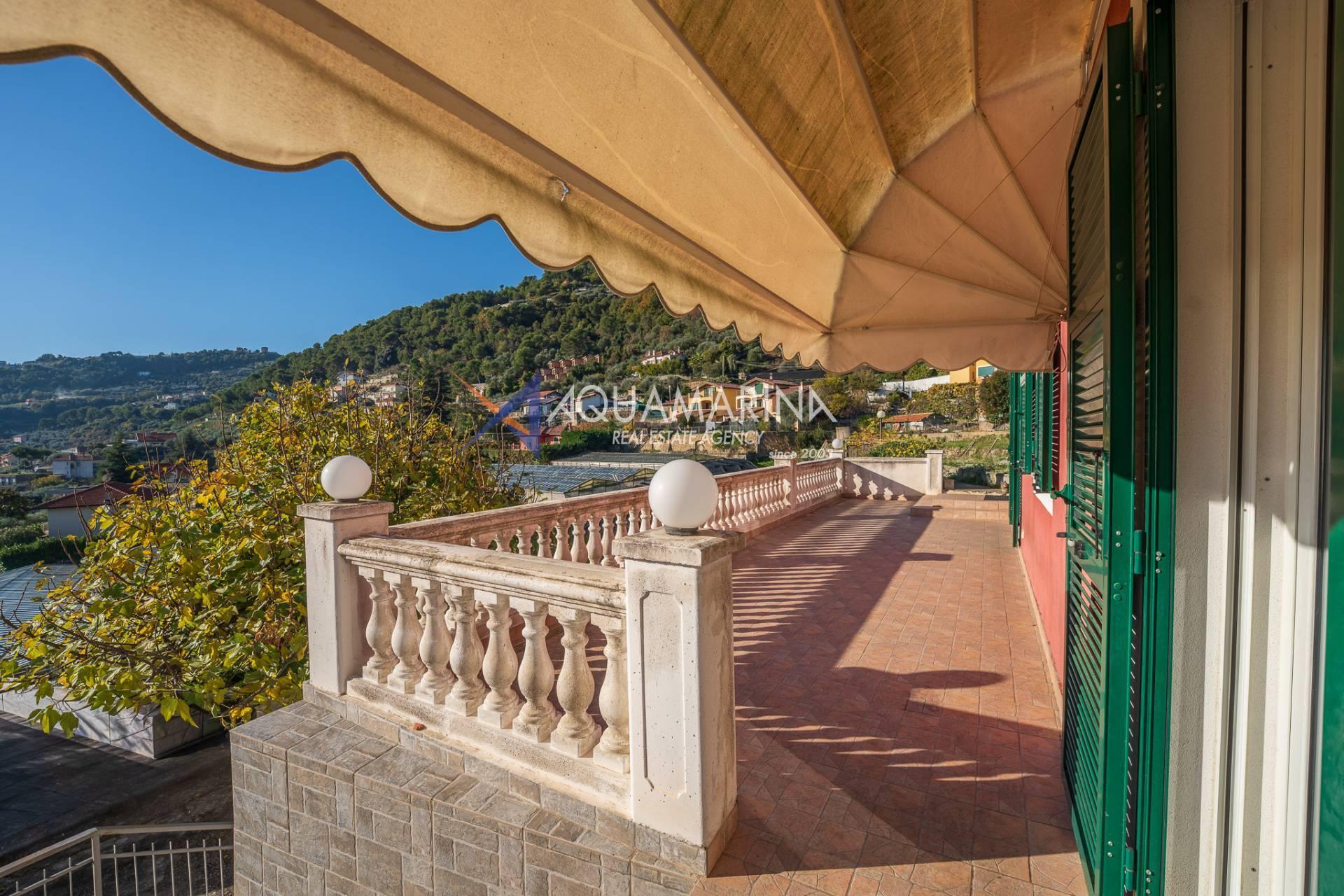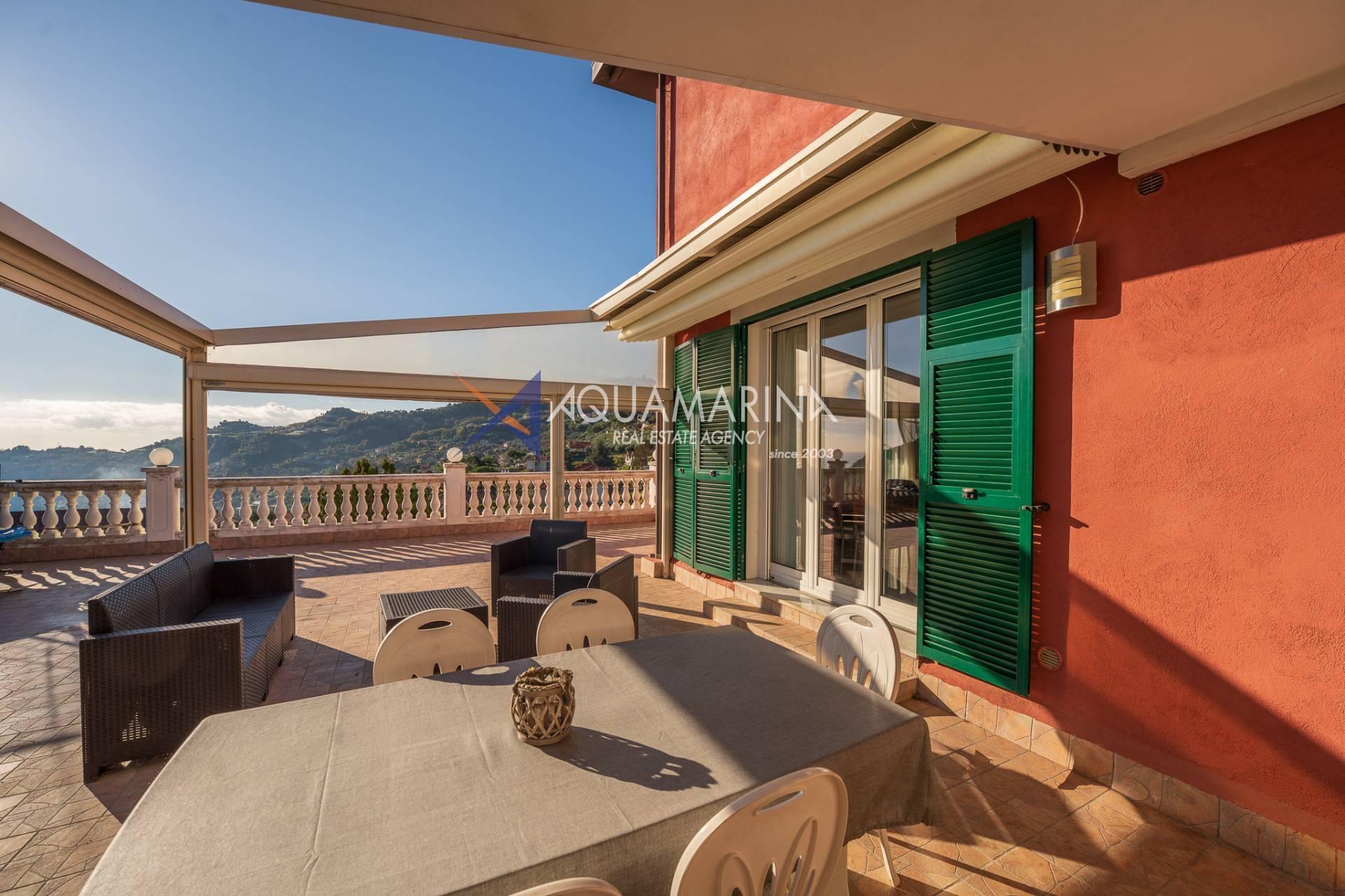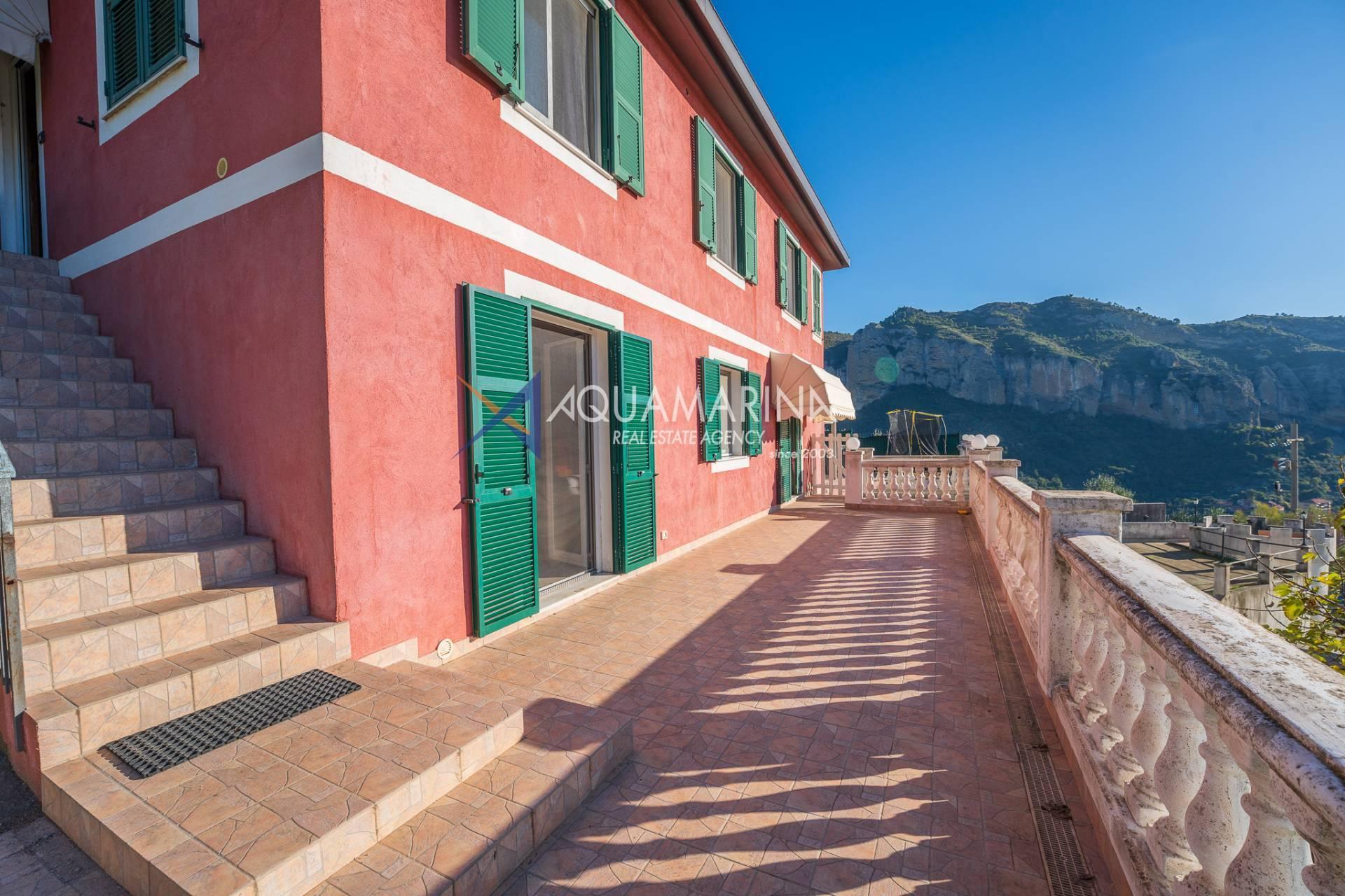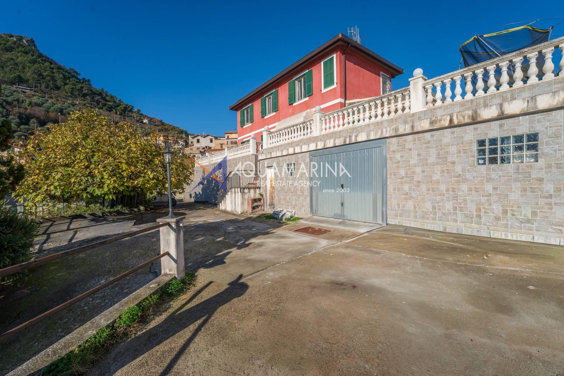 La villa est entourée d'un terrain d'environ 2 500 m², actuellement en partie utilisé comme potager, et de grandes terrasses à l'avant et sur les côtés offrant une vue splendide sur les montagnes et la mer.