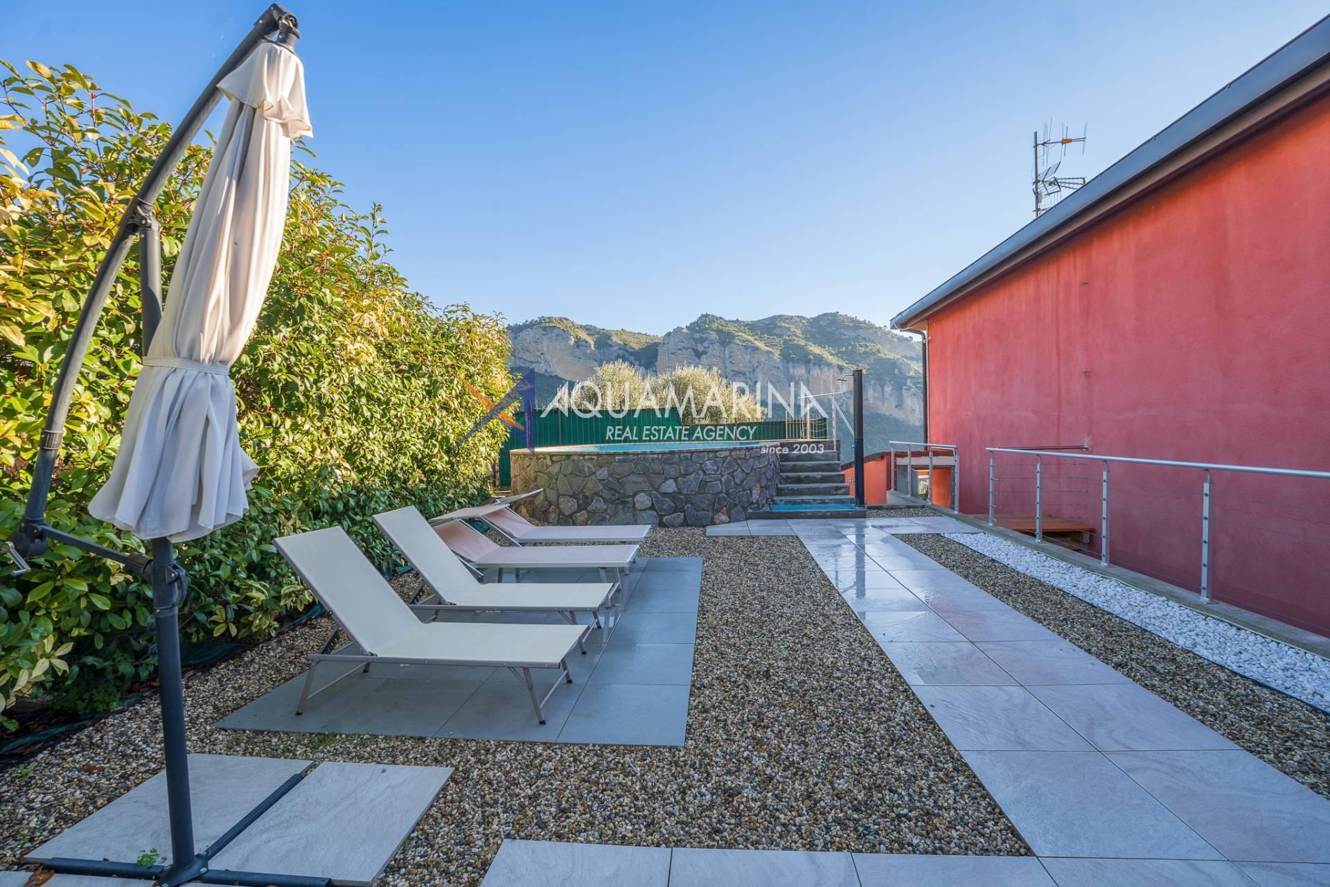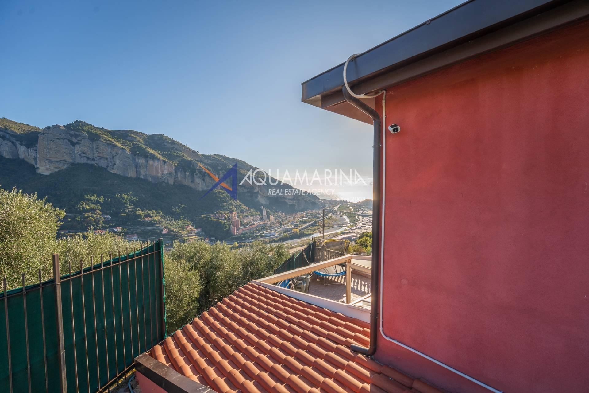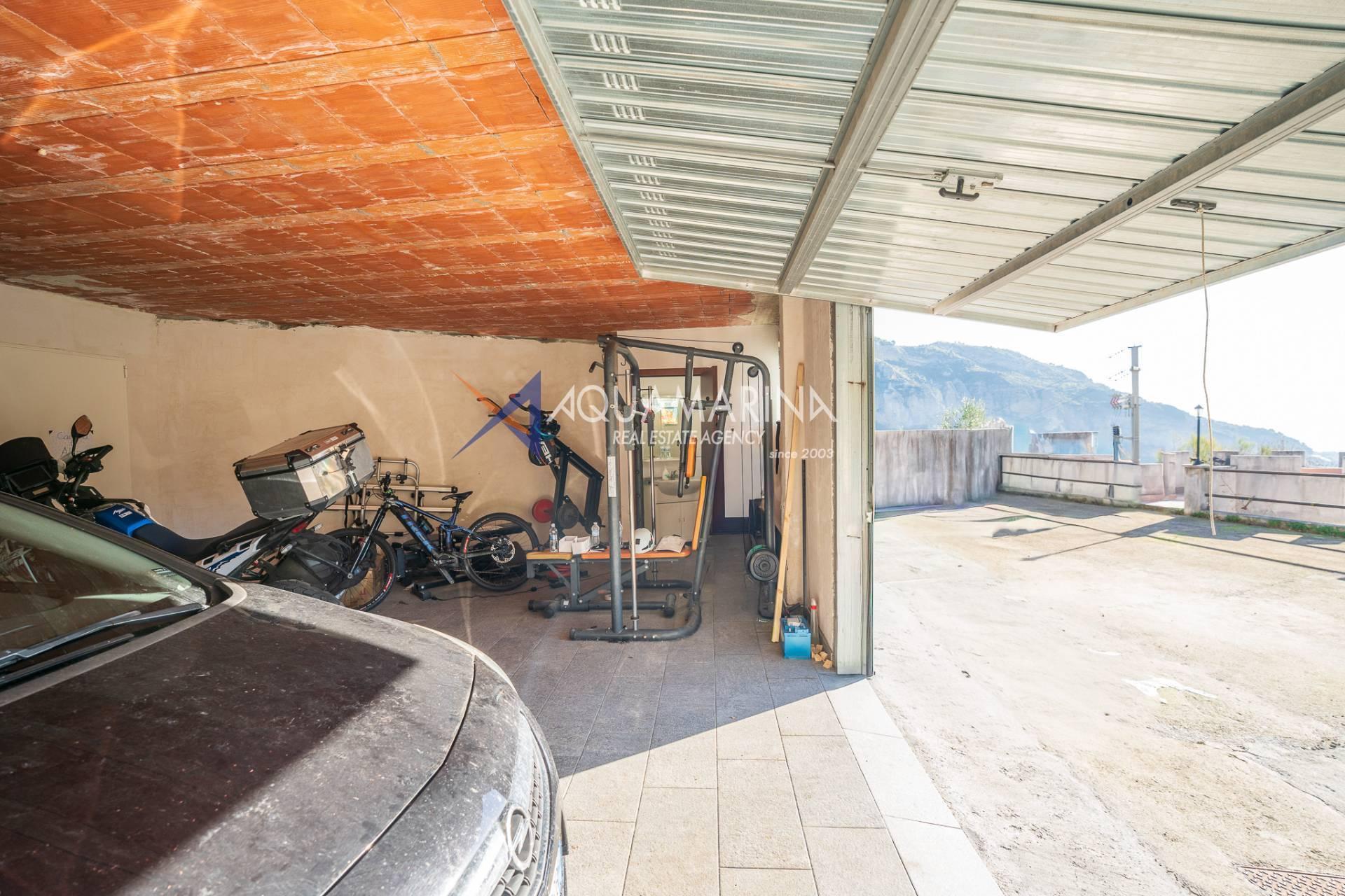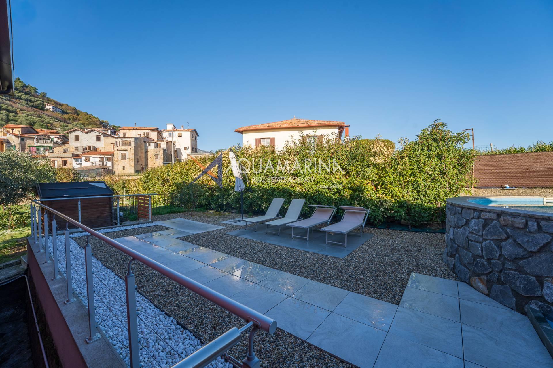 La villa est entourée d'un terrain d'environ 2 500 m², actuellement en partie utilisé comme potager, et de grandes terrasses à l'avant et sur les côtés offrant une vue splendide sur les montagnes et la mer.