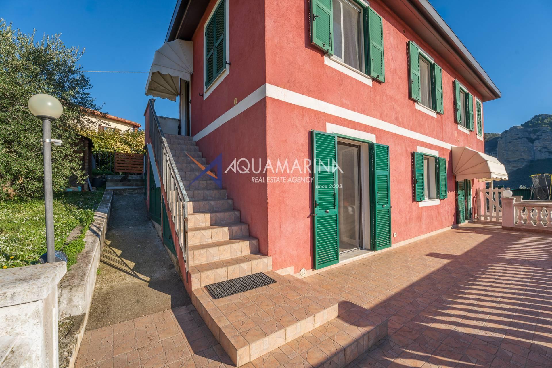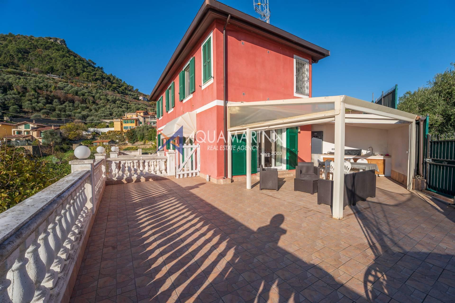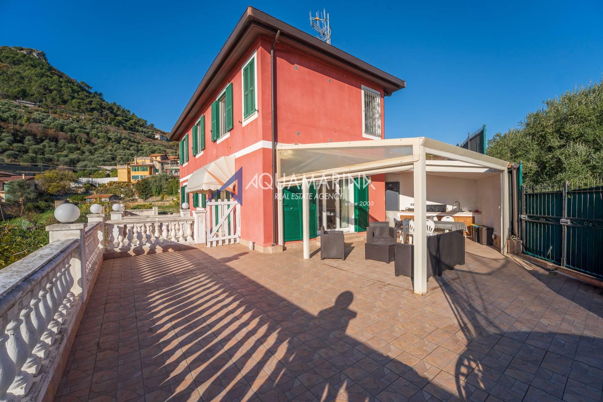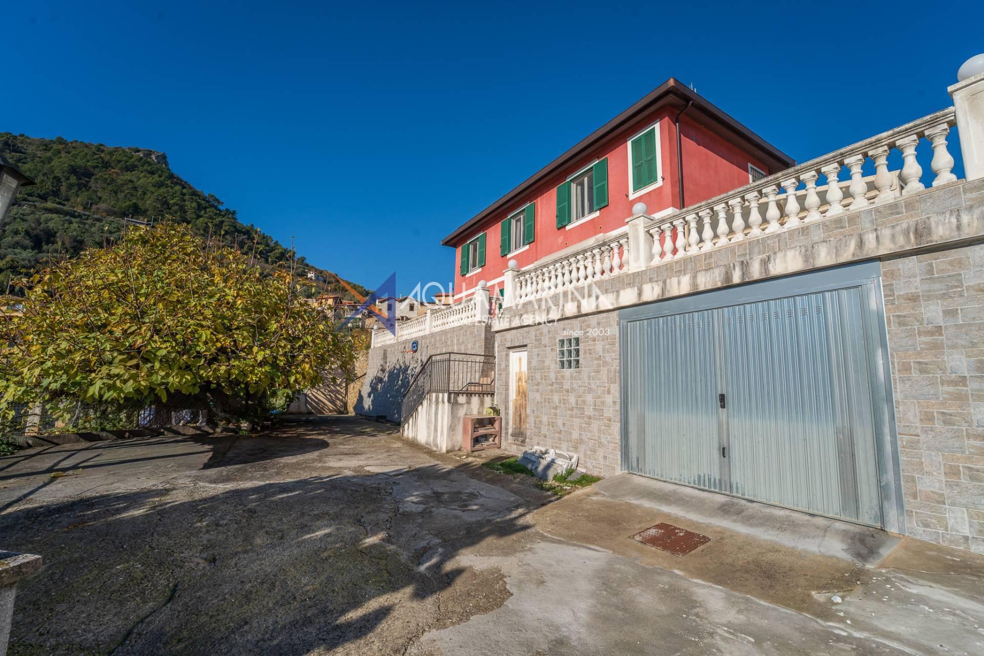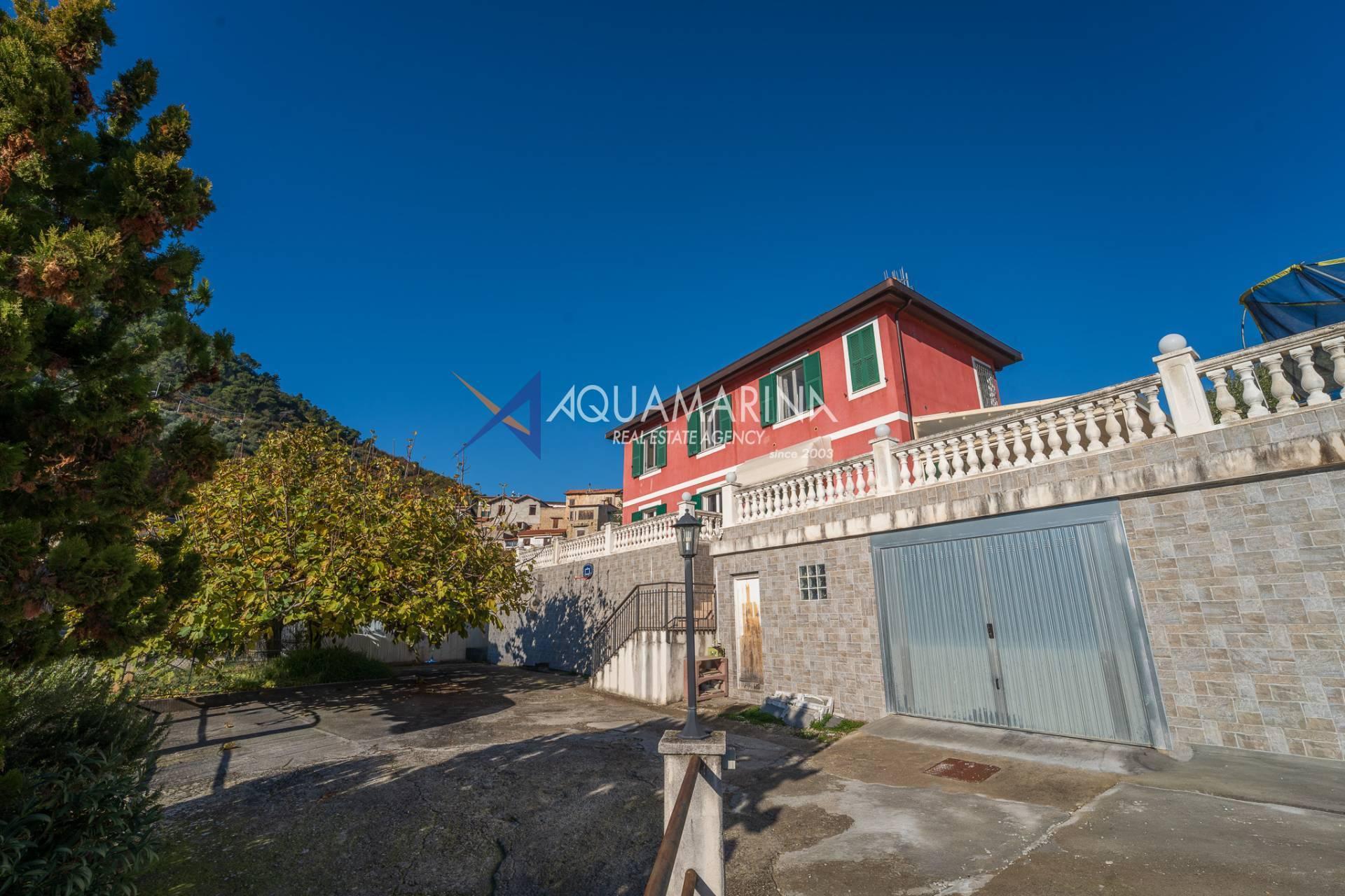 La villa est entourée d'un terrain d'environ 2 500 m², actuellement en partie utilisé comme potager, et de grandes terrasses à l'avant et sur les côtés offrant une vue splendide sur les montagnes et la mer.