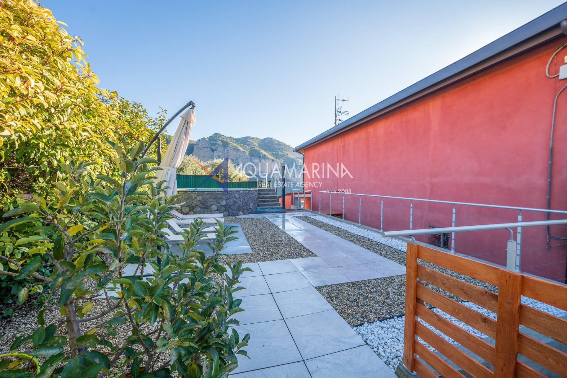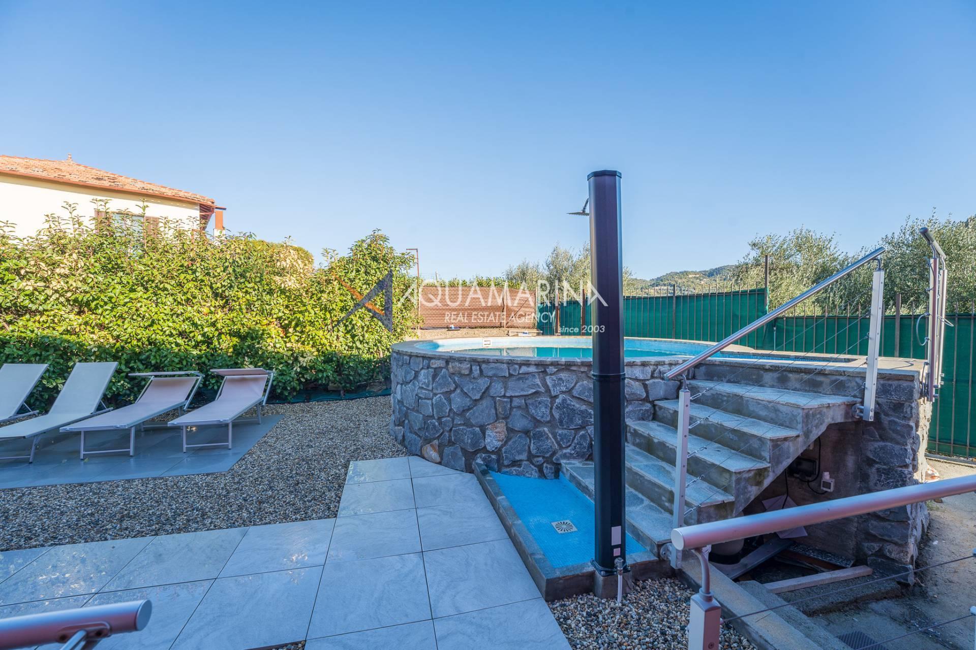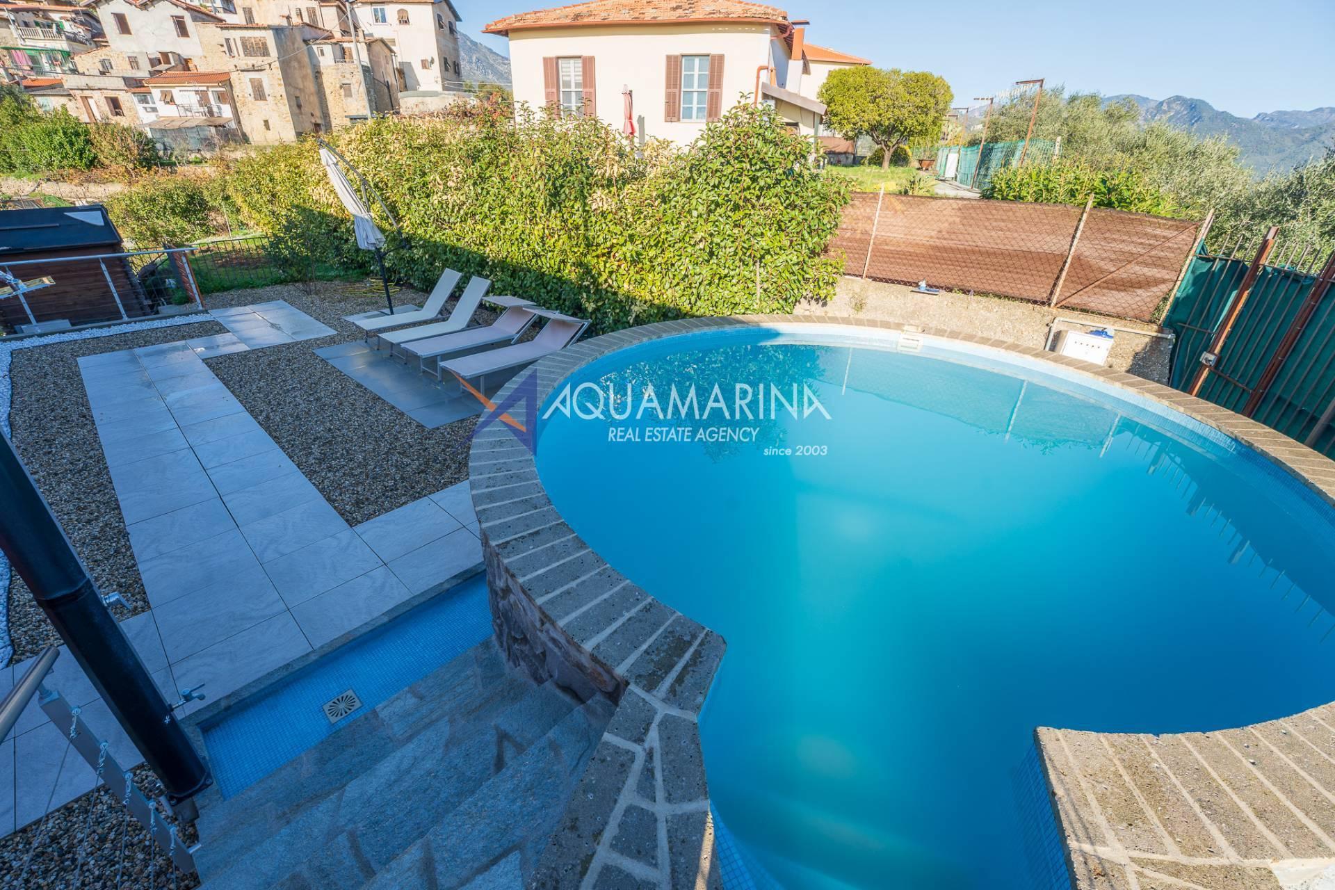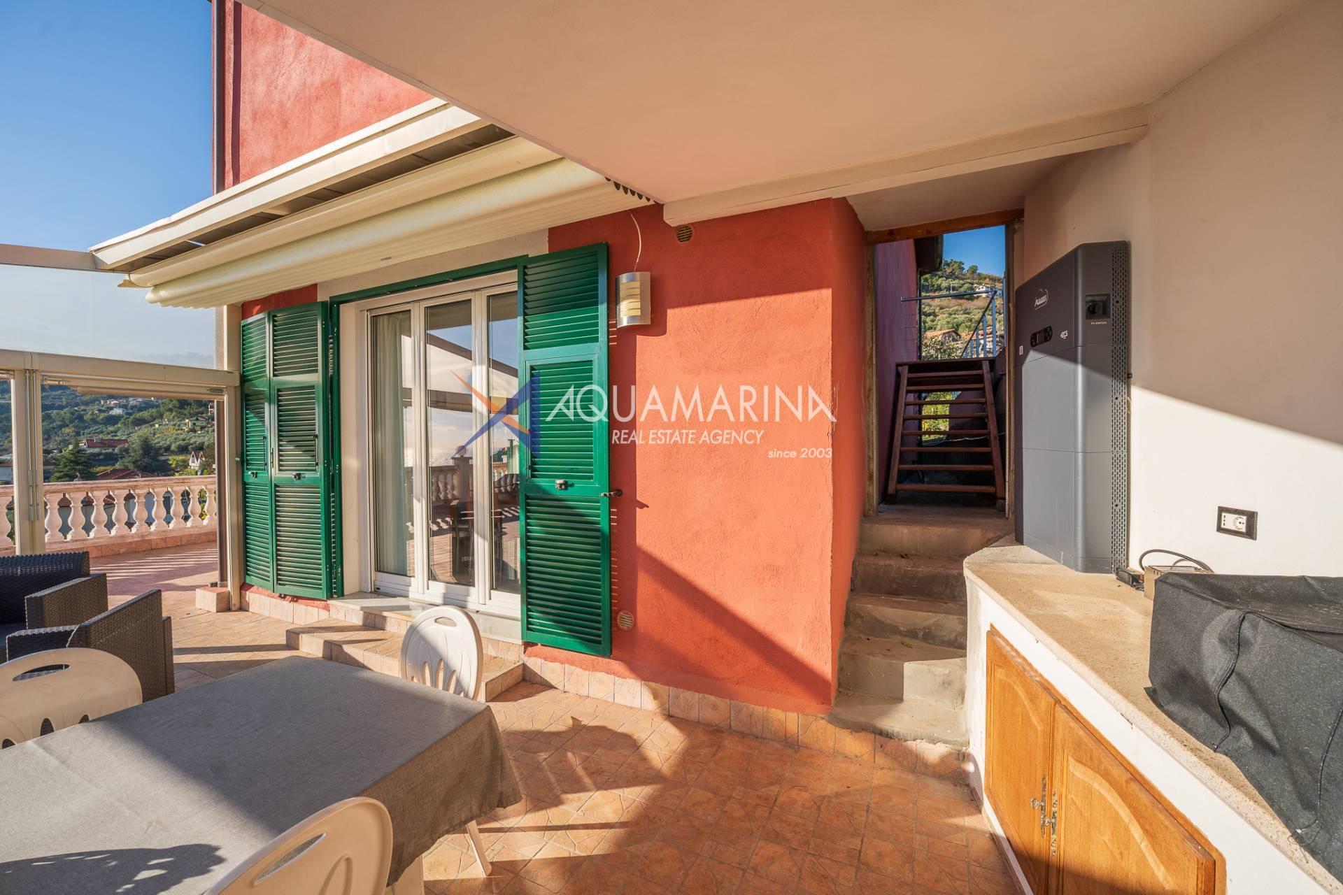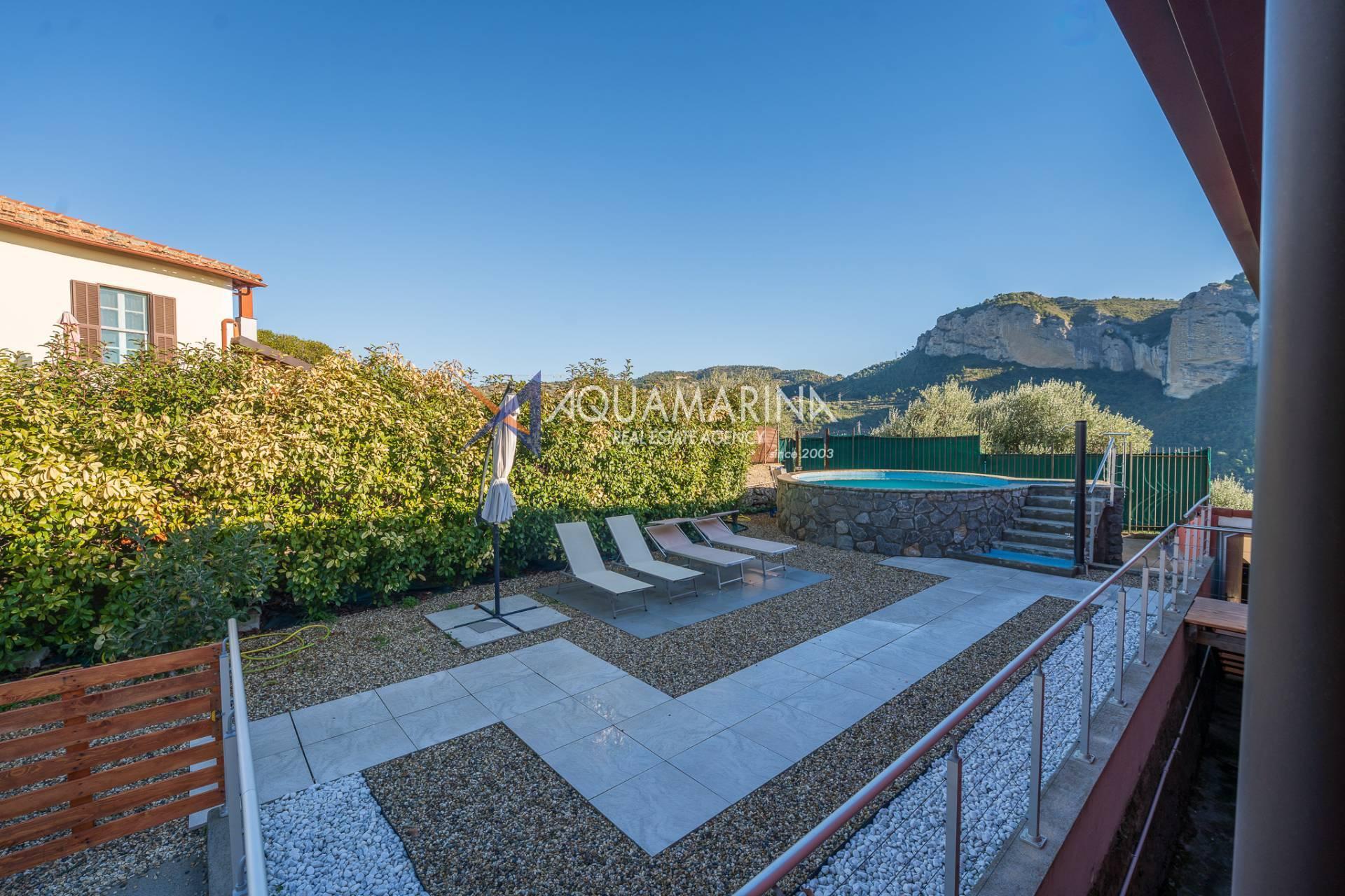 La villa est entourée d'un terrain d'environ 2 500 m², actuellement en partie utilisé comme potager, et de grandes terrasses à l'avant et sur les côtés offrant une vue splendide sur les montagnes et la mer.