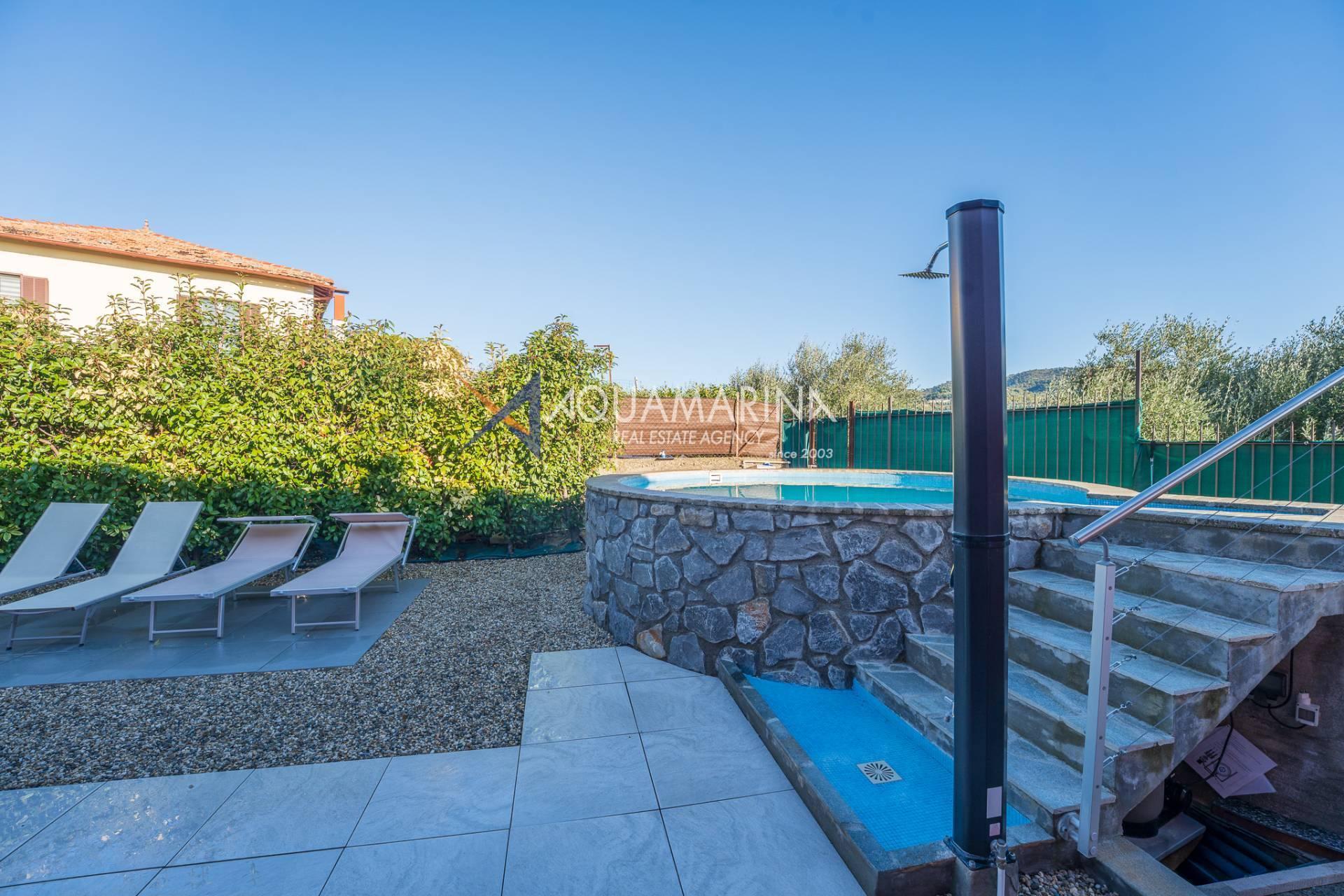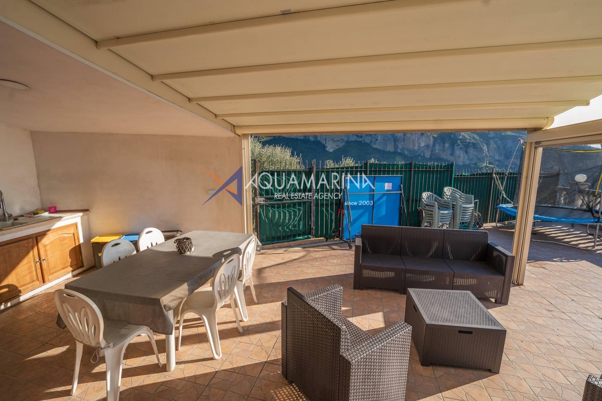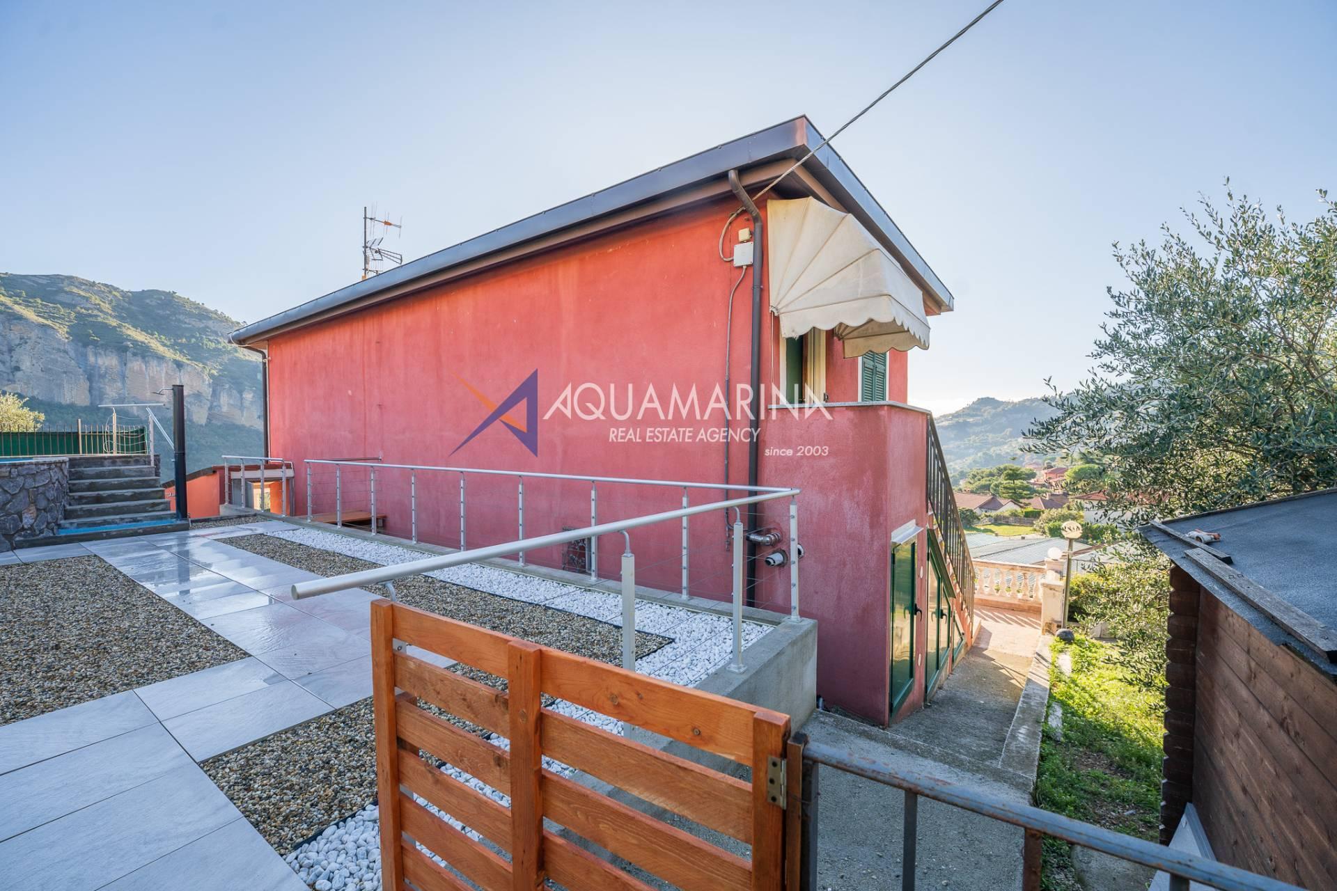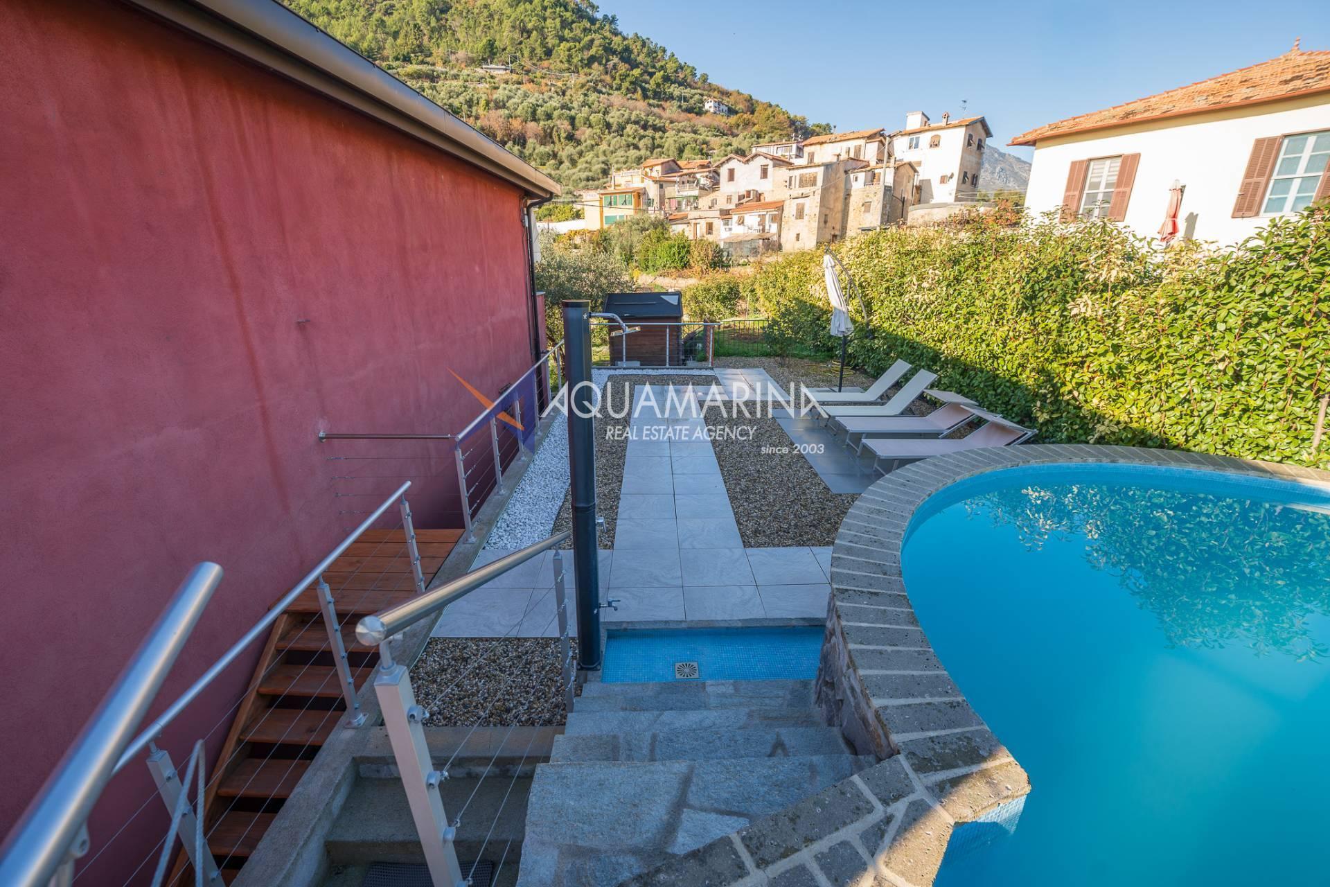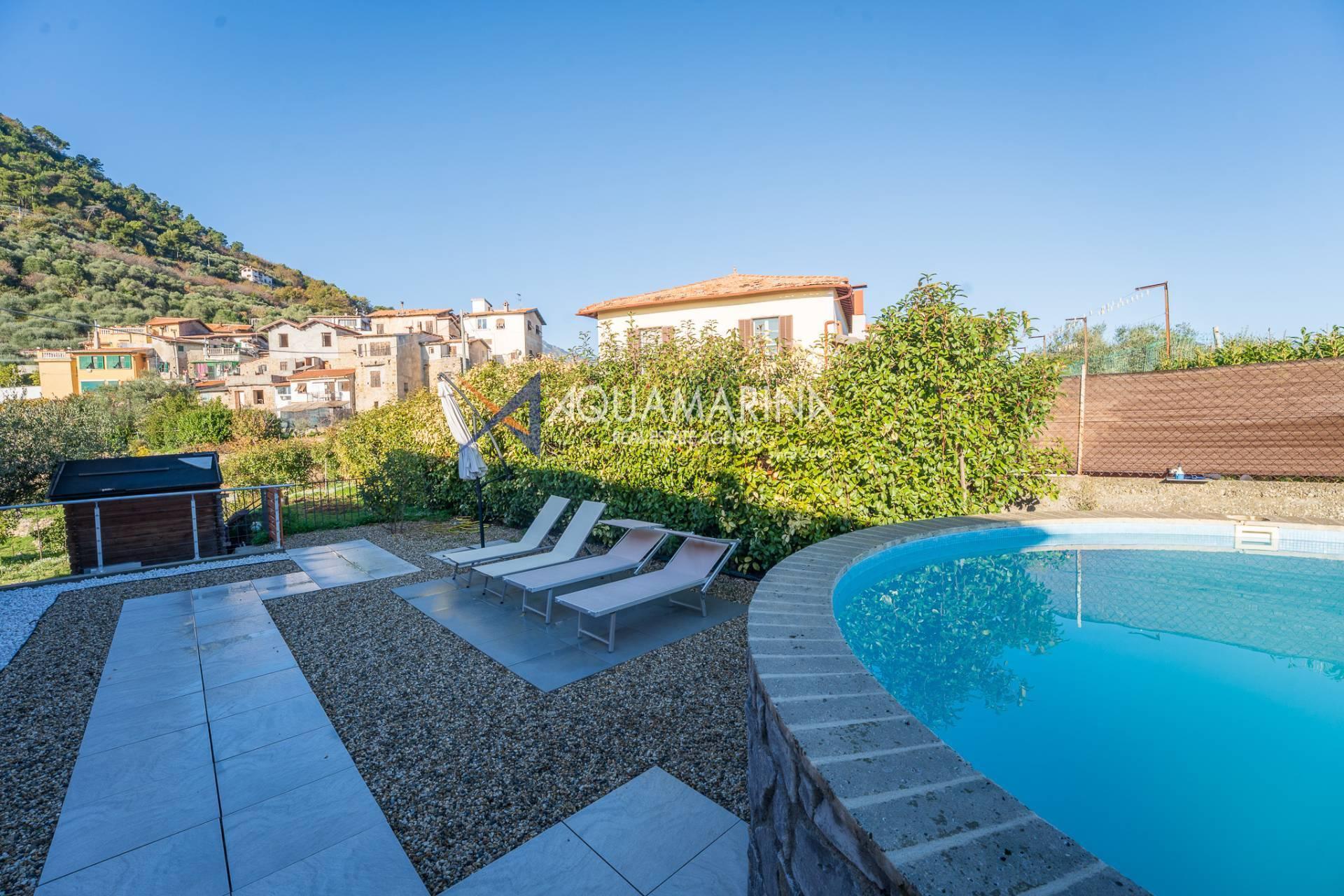 La villa est entourée d'un terrain d'environ 2 500 m², actuellement en partie utilisé comme potager, et de grandes terrasses à l'avant et sur les côtés offrant une vue splendide sur les montagnes et la mer.