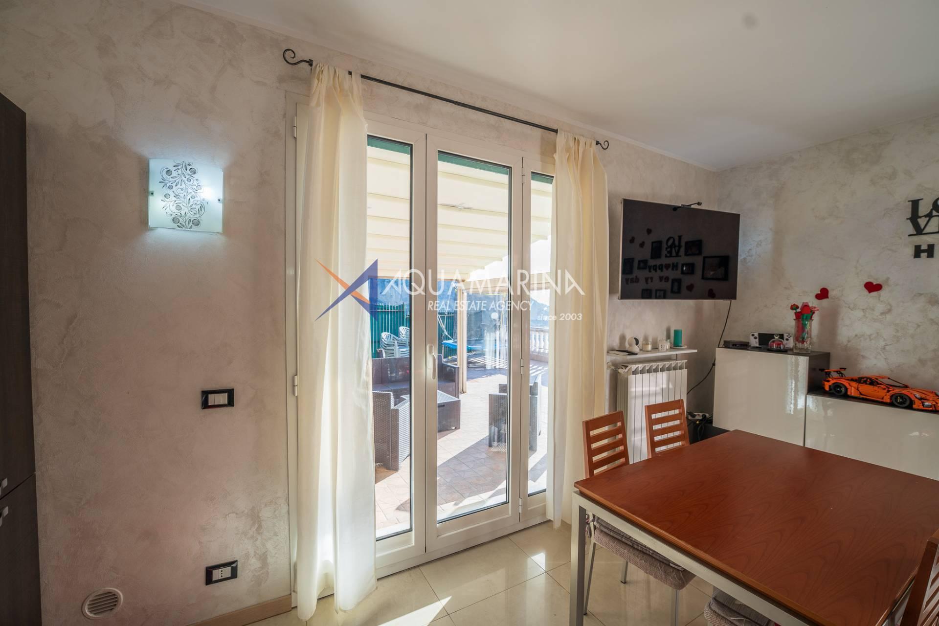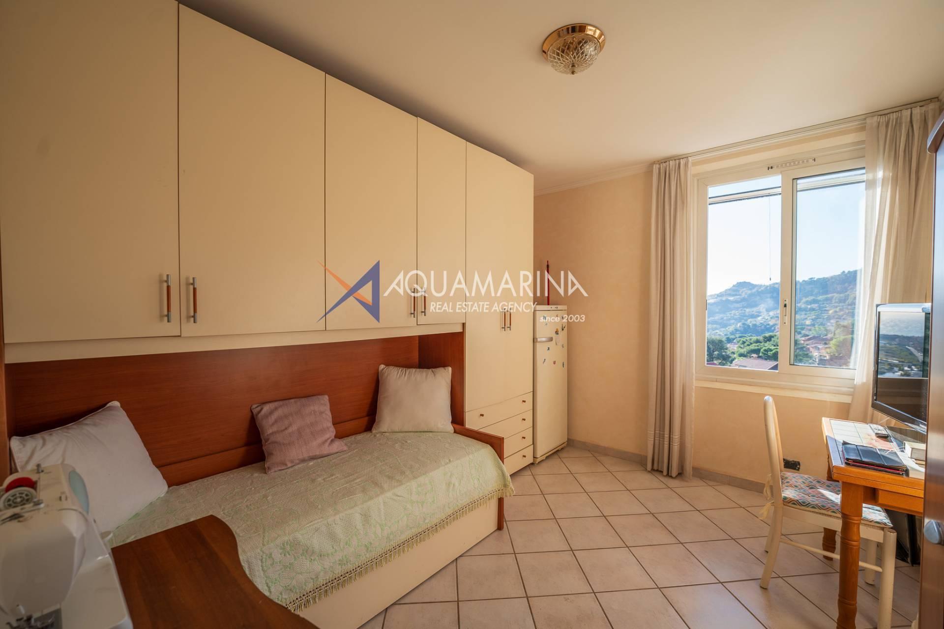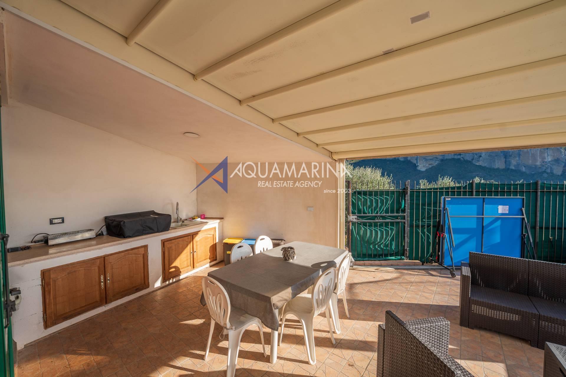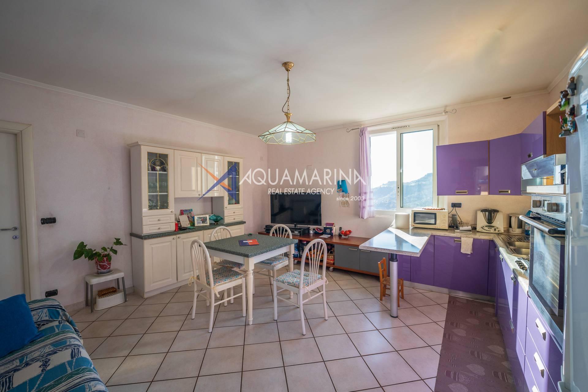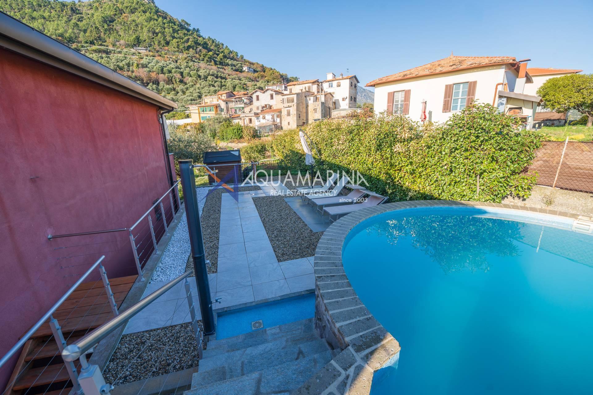 La villa est entourée d'un terrain d'environ 2 500 m², actuellement en partie utilisé comme potager, et de grandes terrasses à l'avant et sur les côtés offrant une vue splendide sur les montagnes et la mer.