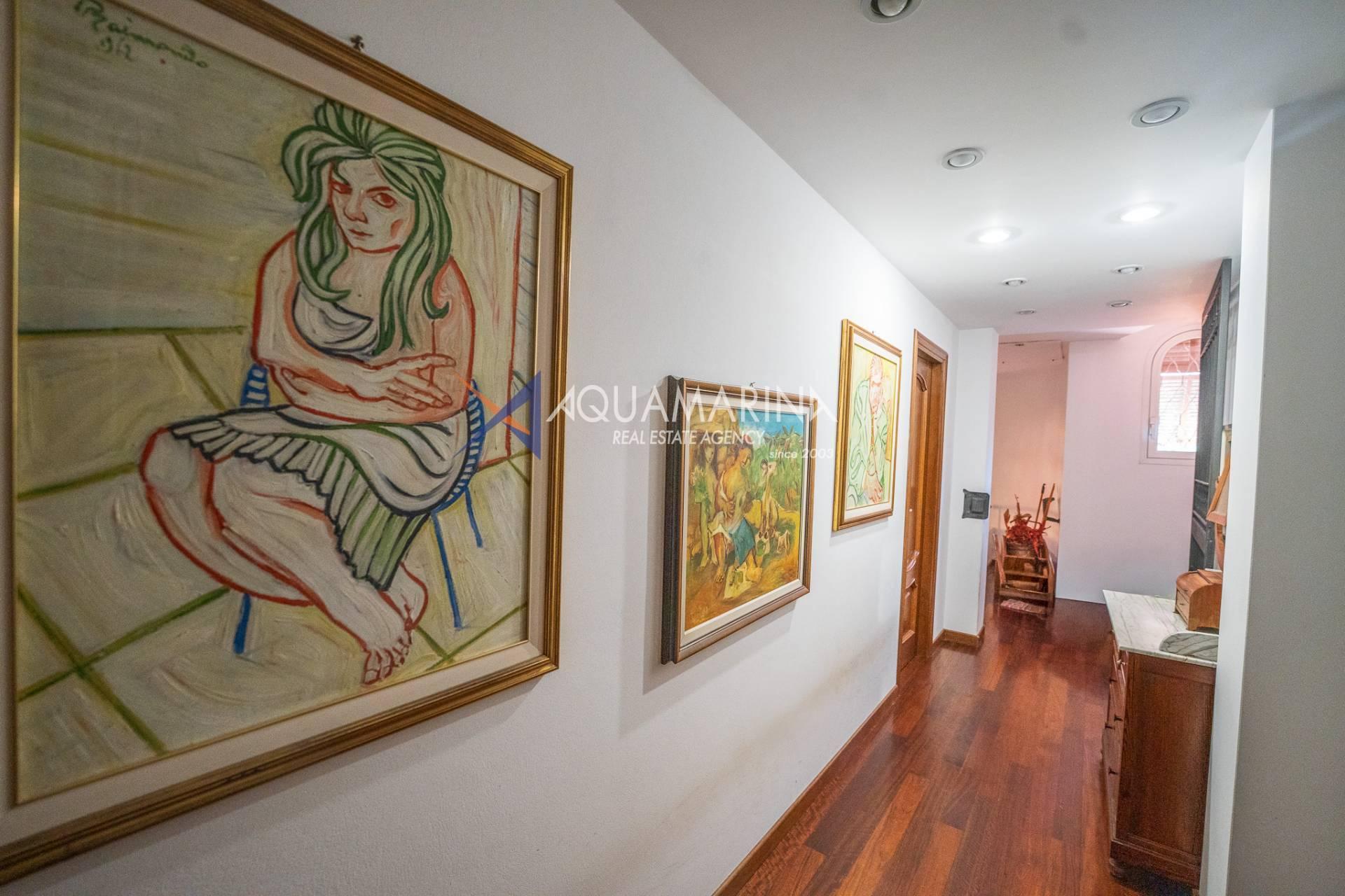 Avec une surface habitable de 750 m², la villa dispose de six chambres, quatre salles de bains, un balcon, des placards intégrés et une cave.